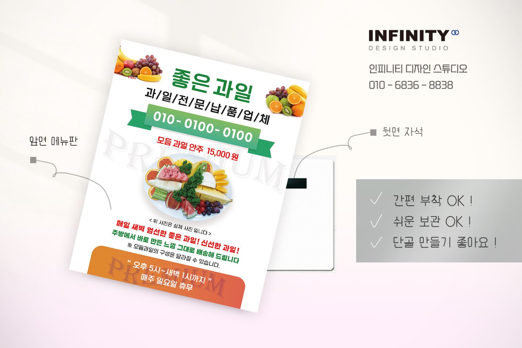 앞면에는 메뉴 또는 정보를 담아