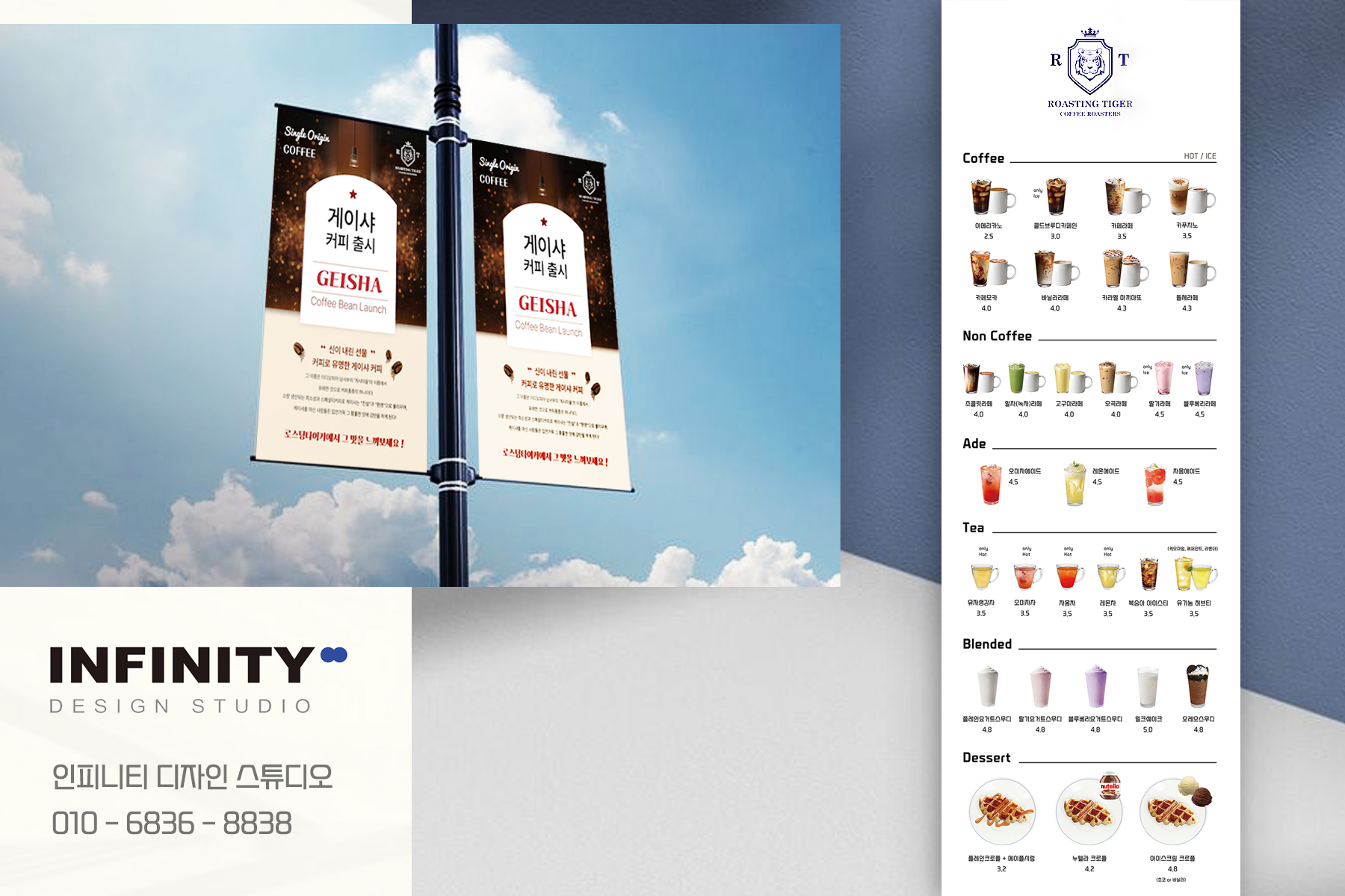 안녕하세요, 카페 배너 제작 전문 인피니티 디자인 스튜디오 입니다. 전 메뉴를 담은 깔끔한 배너 제작, 카페 운영중이신 사장님들께 인기만점 배너로 메뉴배너 준비중이시라면, 추천드립니다.