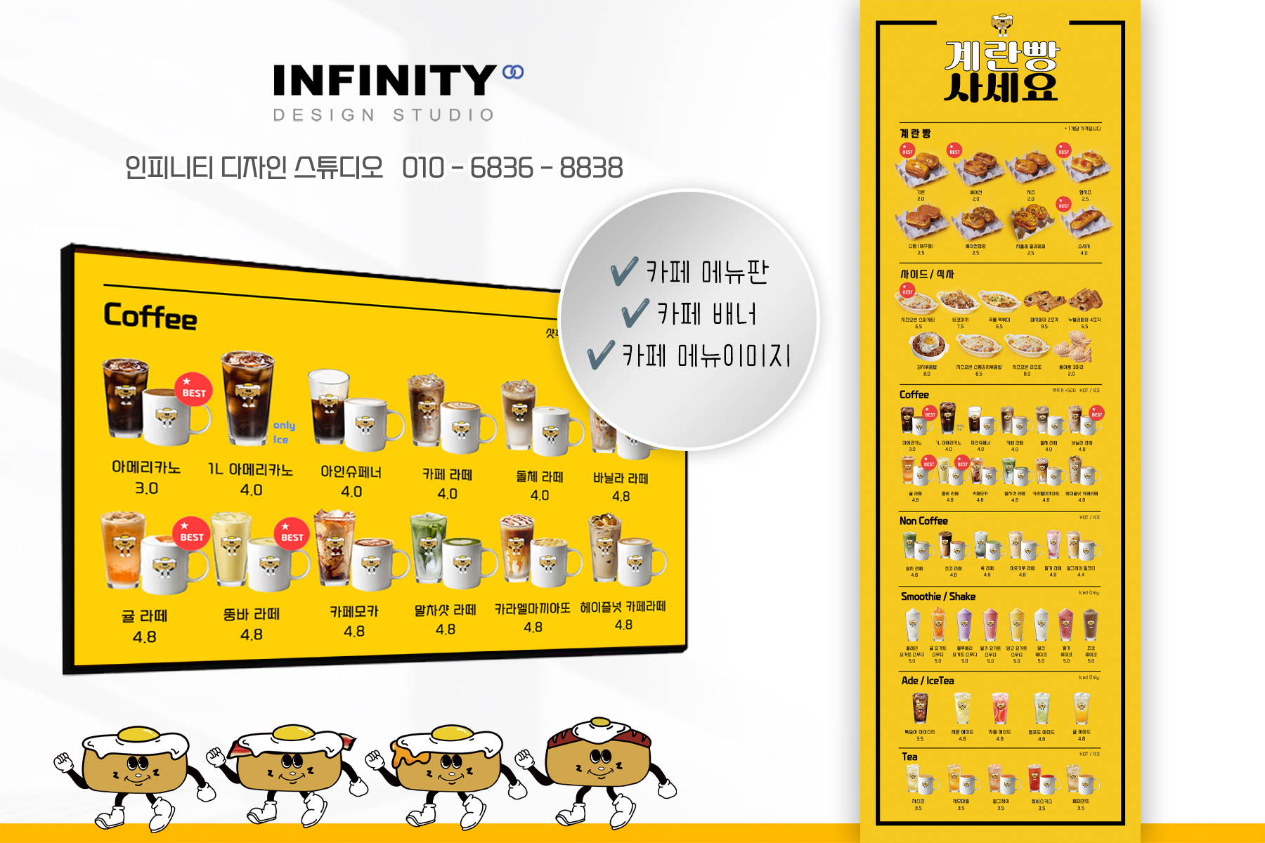 안녕하세요, 카페 홍보물 제작 전문 인피니티 디자인 스튜디오 입니다. 오늘은 인기만점! 카페사장님들께 사랑받는 아이템, 메뉴 이미지 제작 + 배너 + 메뉴판 등 카페 패키지 추천 포스팅 드립