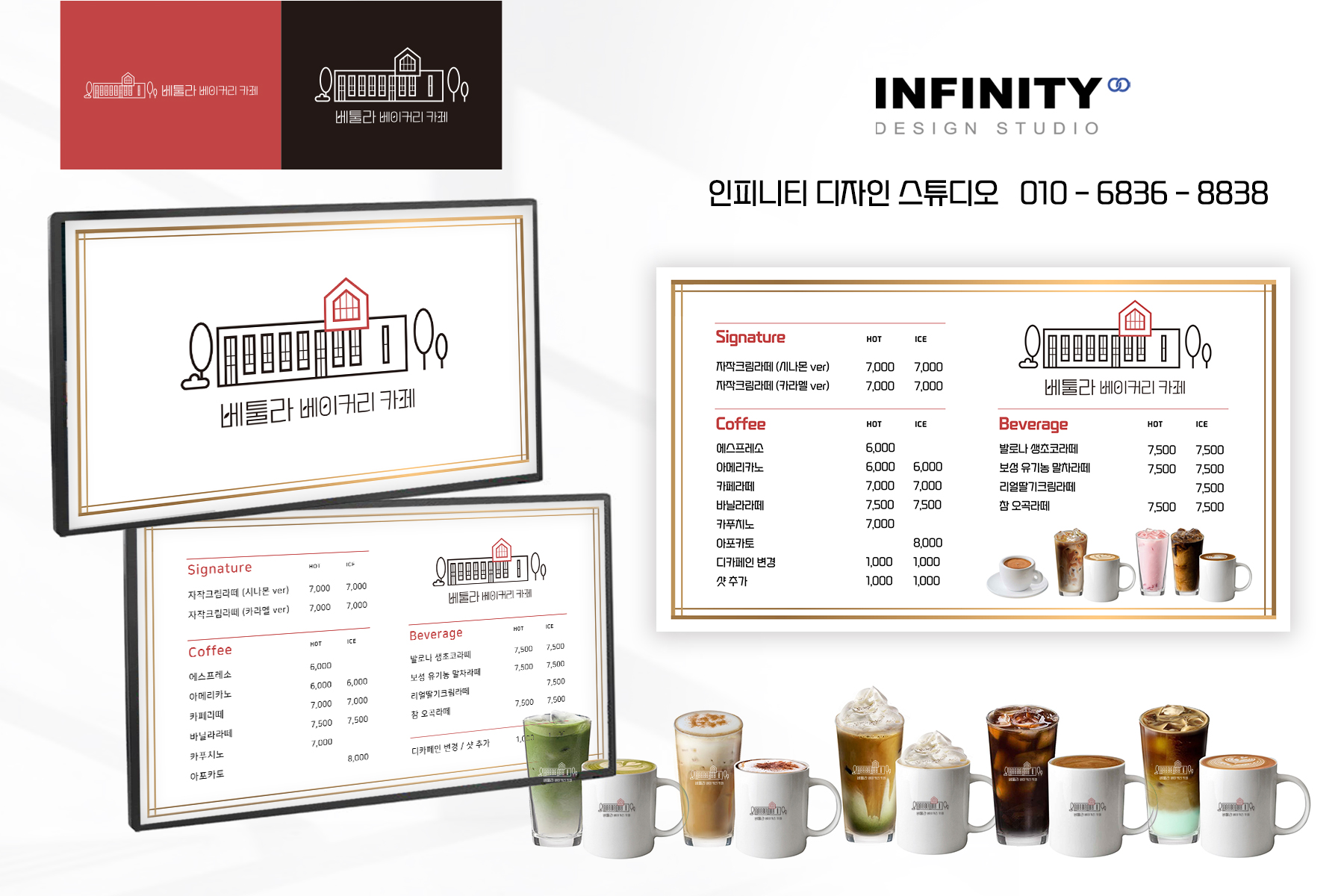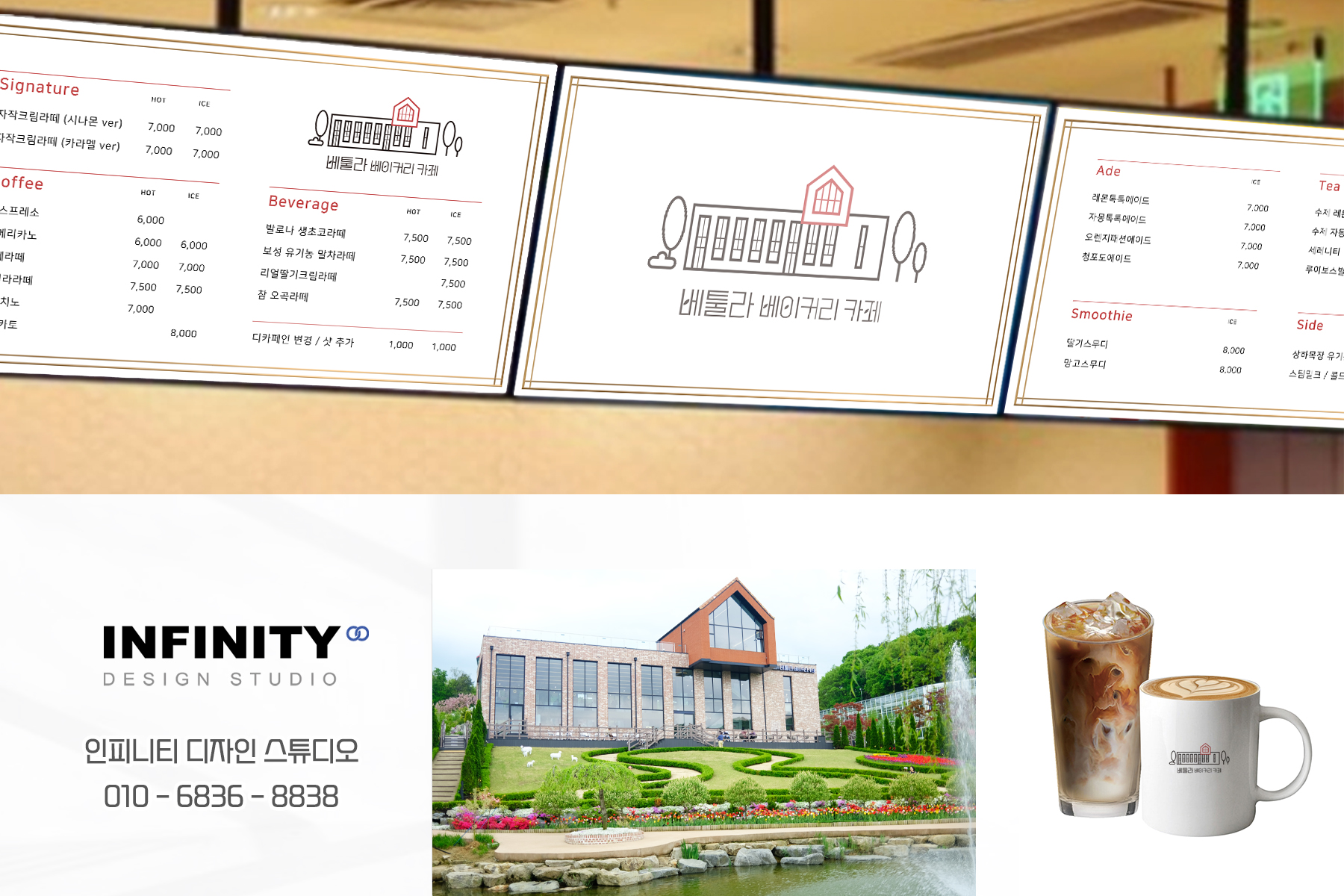 안녕하세요, 디자인, 제작 전문 인피니티 디자인 스튜디오 입니다. 프랜차이즈 카페 메뉴 촬영 대신 제작으로 완성! 배너, 메뉴판, 명함, 스티커 패키지 오늘은 서울 종로에 위치한 프랜차이즈