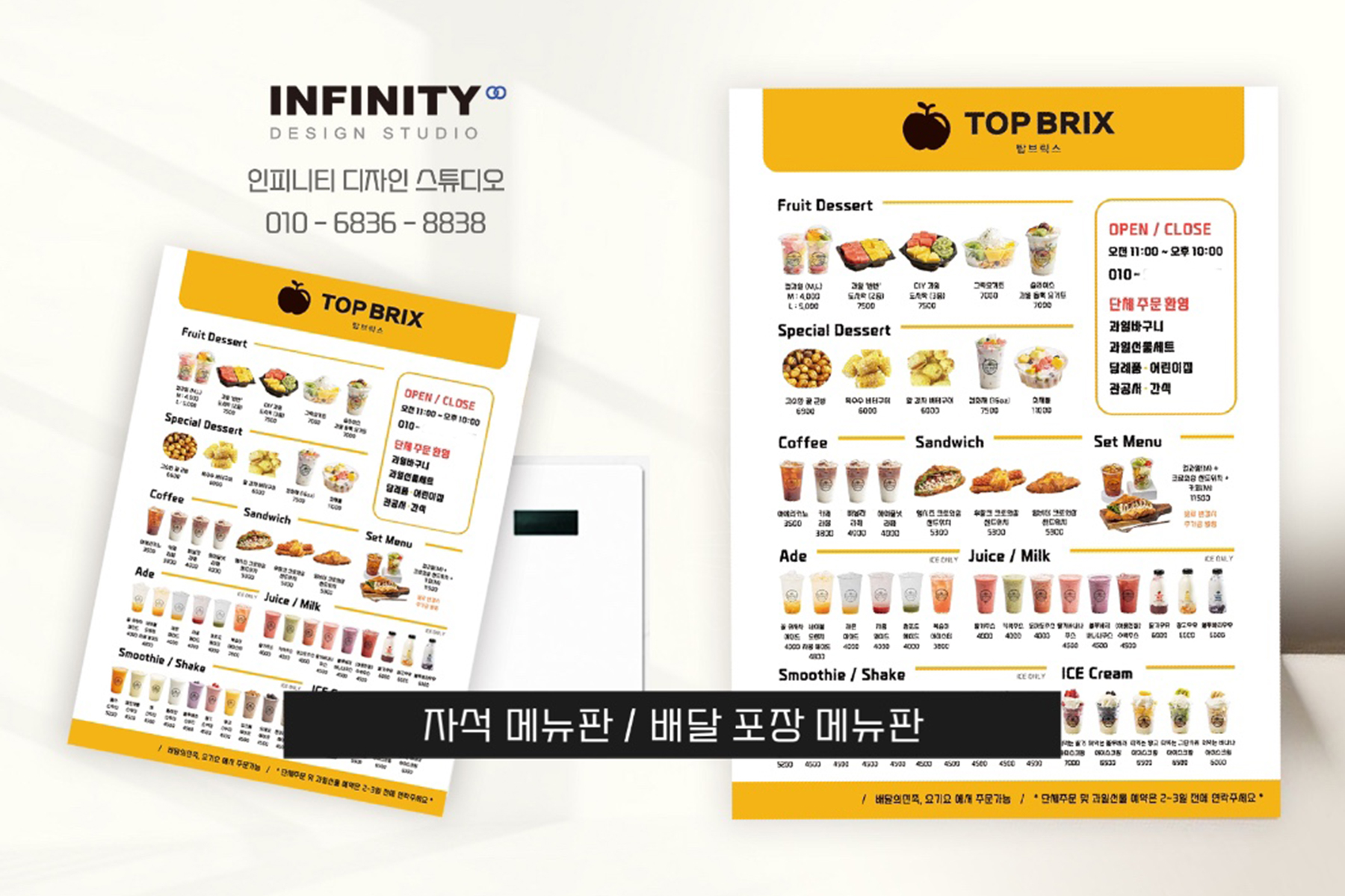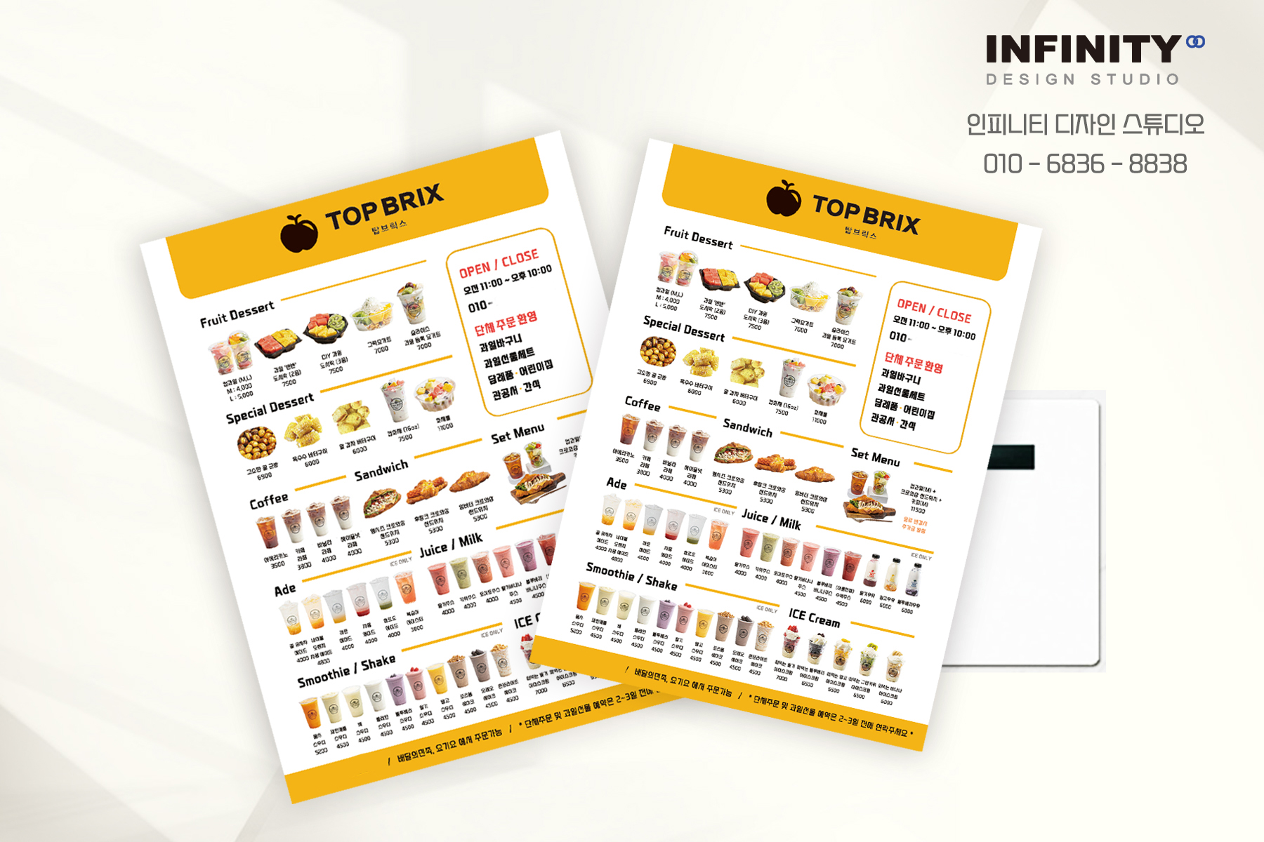 안녕하세요, 냉장고 메뉴판 제작 전문 인피니티 디자인 스튜디오 입니다 부산 냉장고 메뉴판 제작 전문으로 전국배송 납기일에 맞춰 배송해드리니 필수 아이템 제작 + 디자인 맡겨보세요 ! 앞면