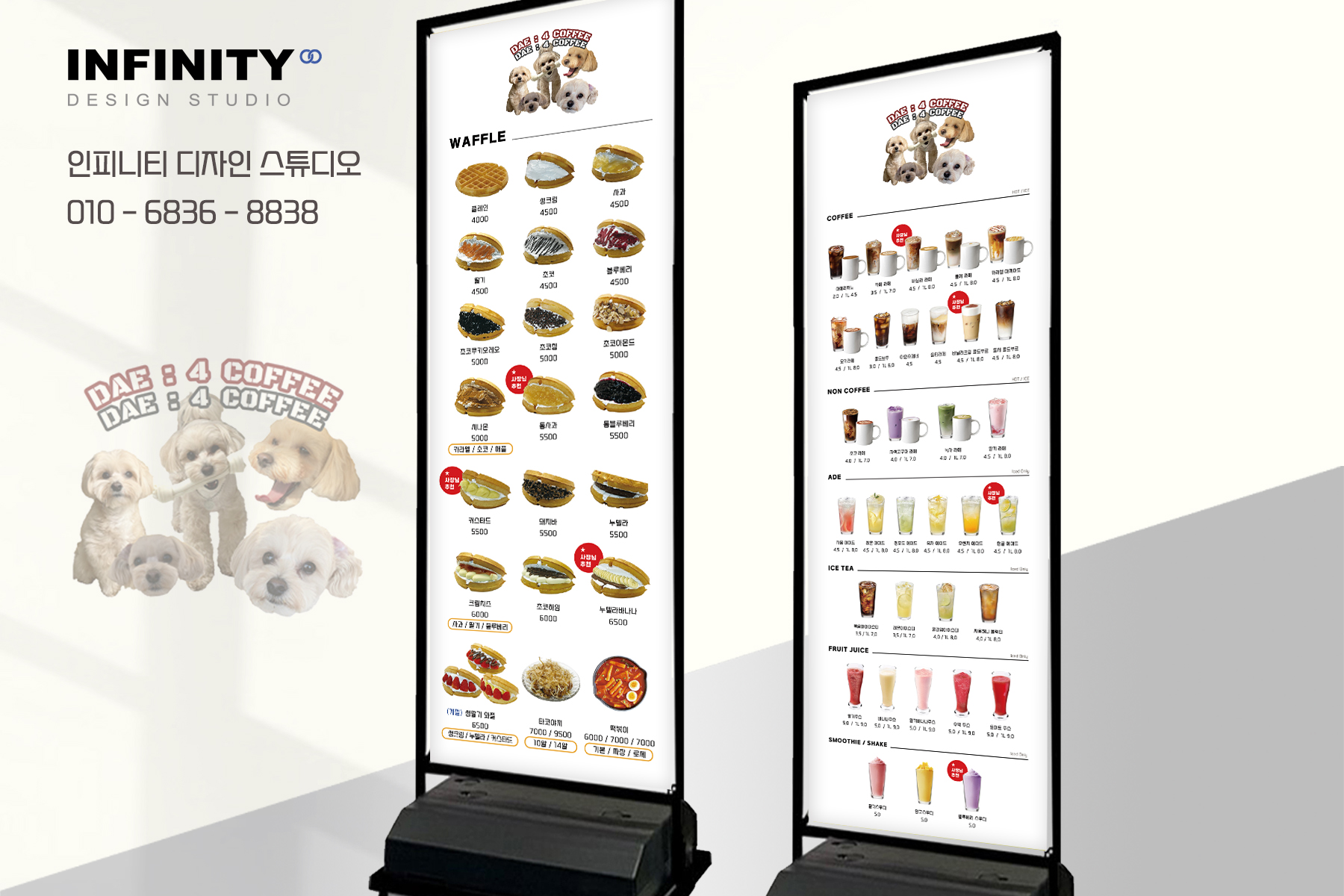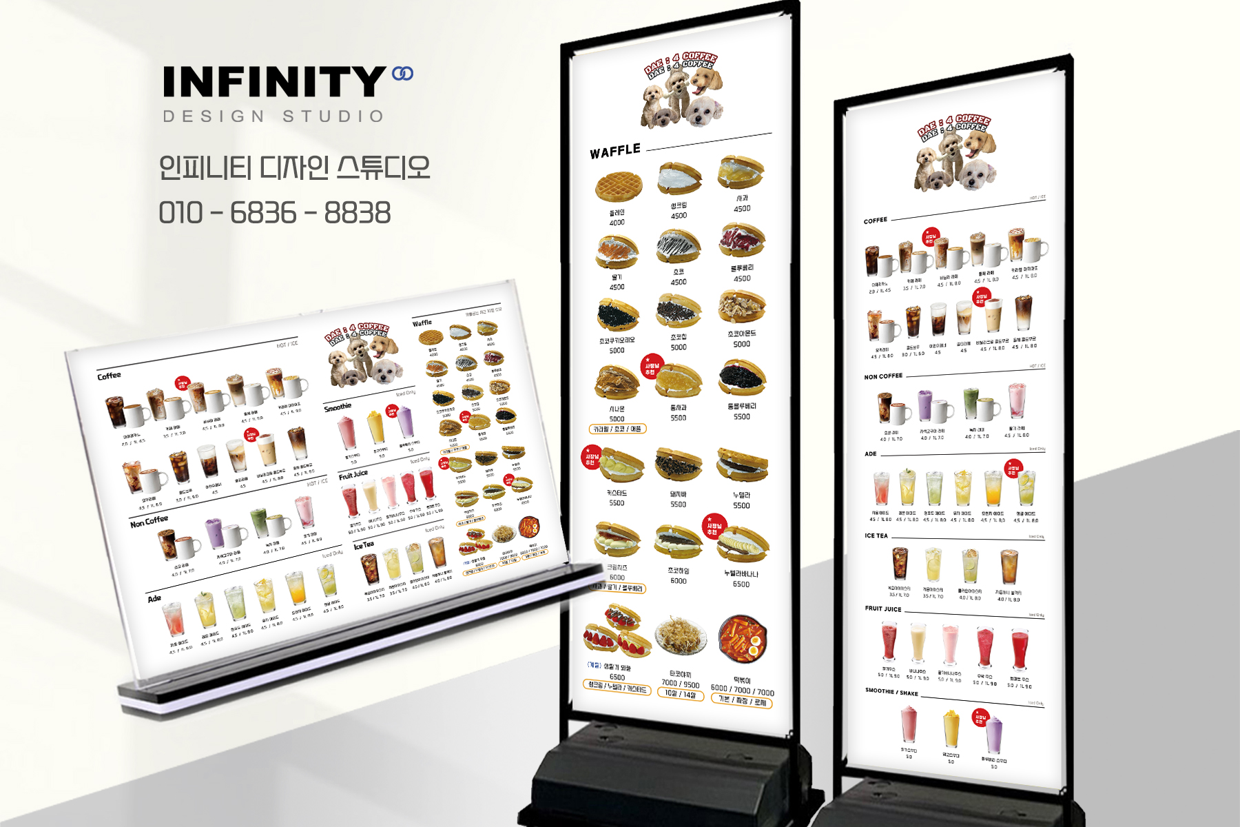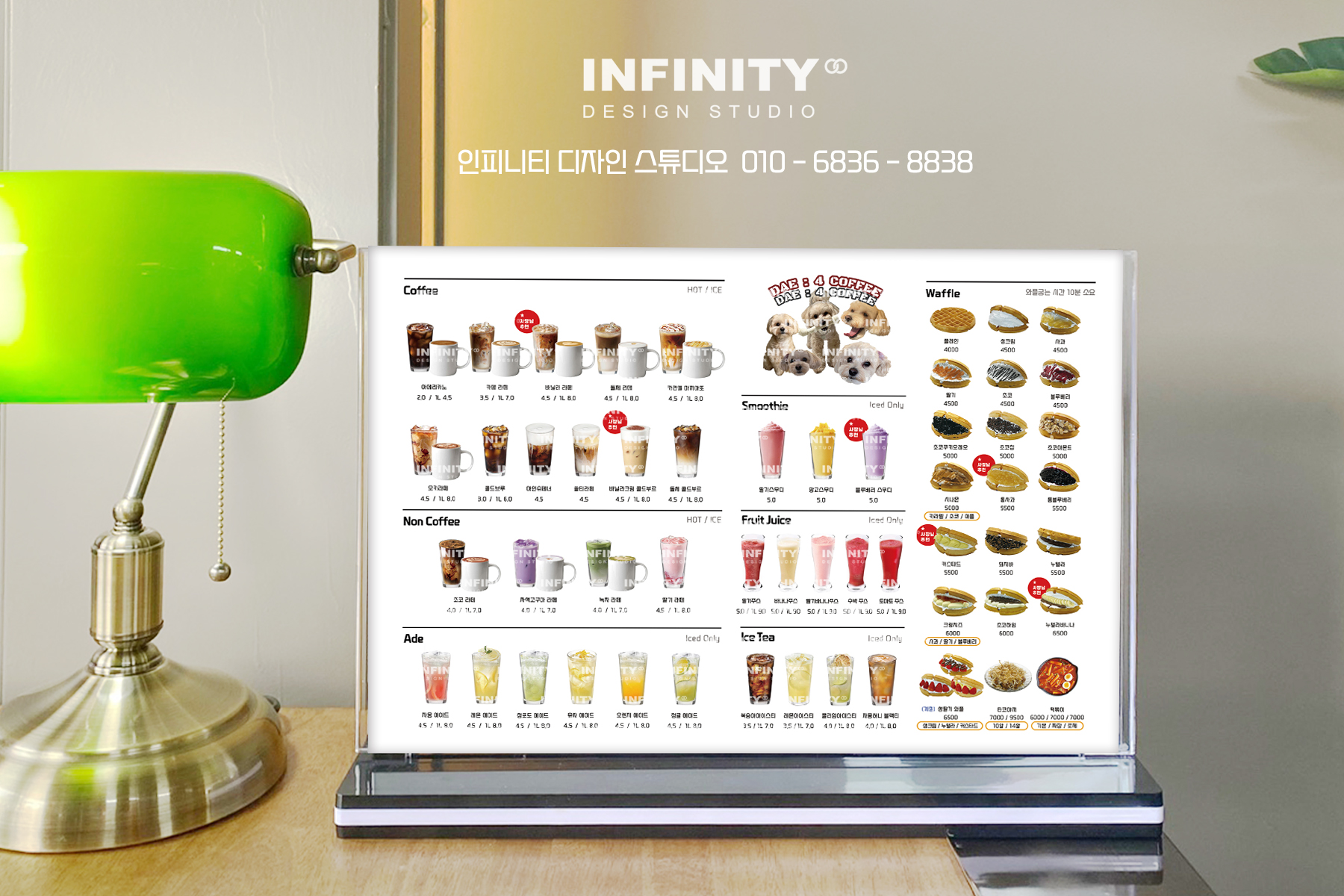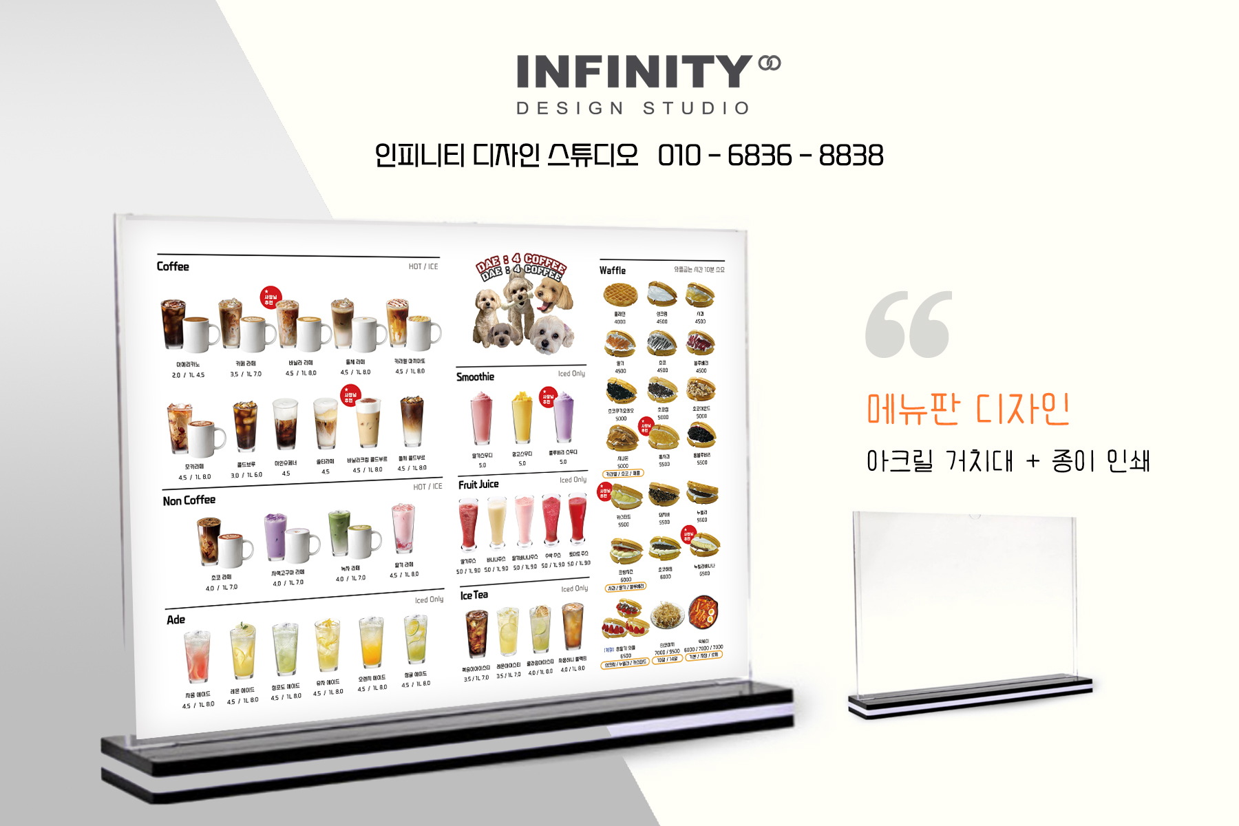 안녕하세요, 디자인, 제작 전문인피니티 디자인 스튜디오 입니다. 오늘은 세워두는 아크릴거치대 메뉴판소개 포스팅 드립니다. 음료 메뉴 구성과 디저트 메뉴 구성을나란히 두어 보기 좋게