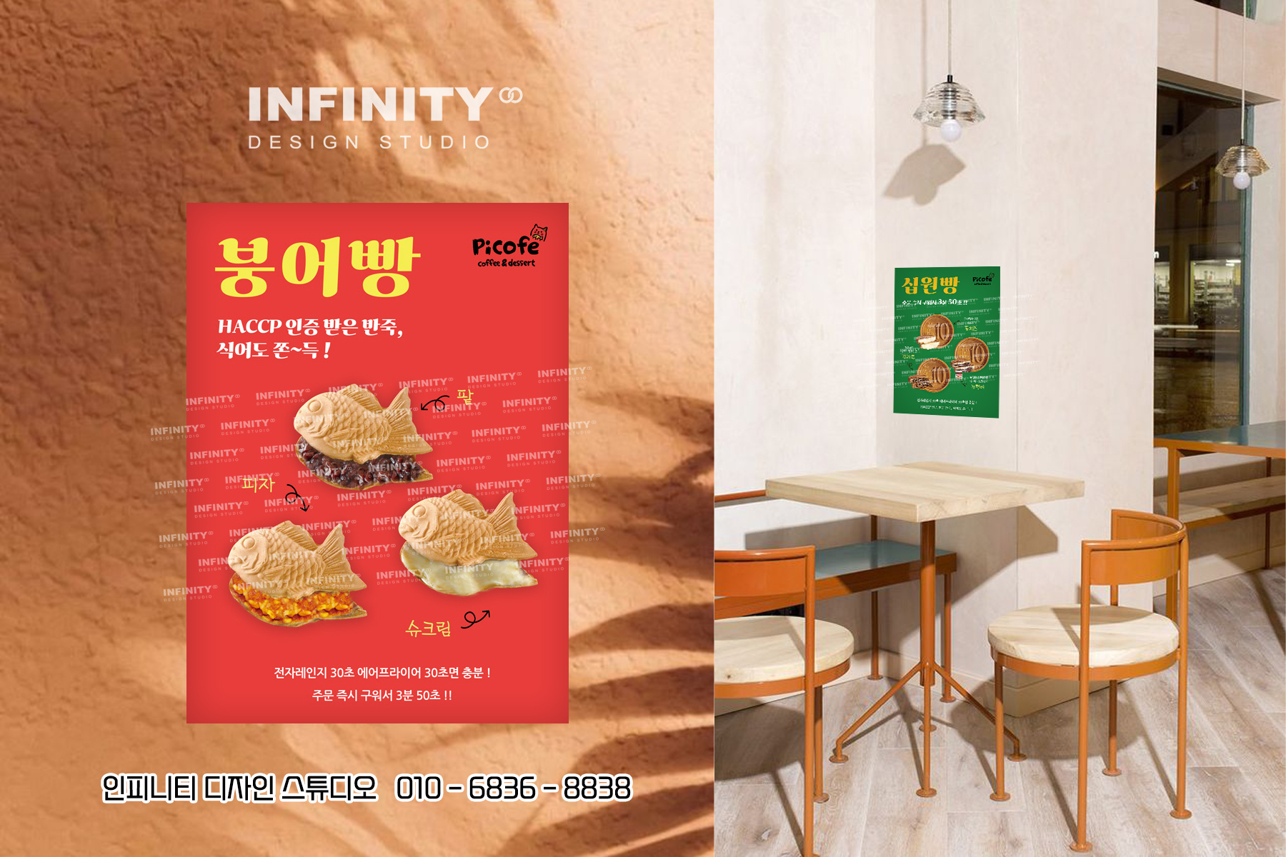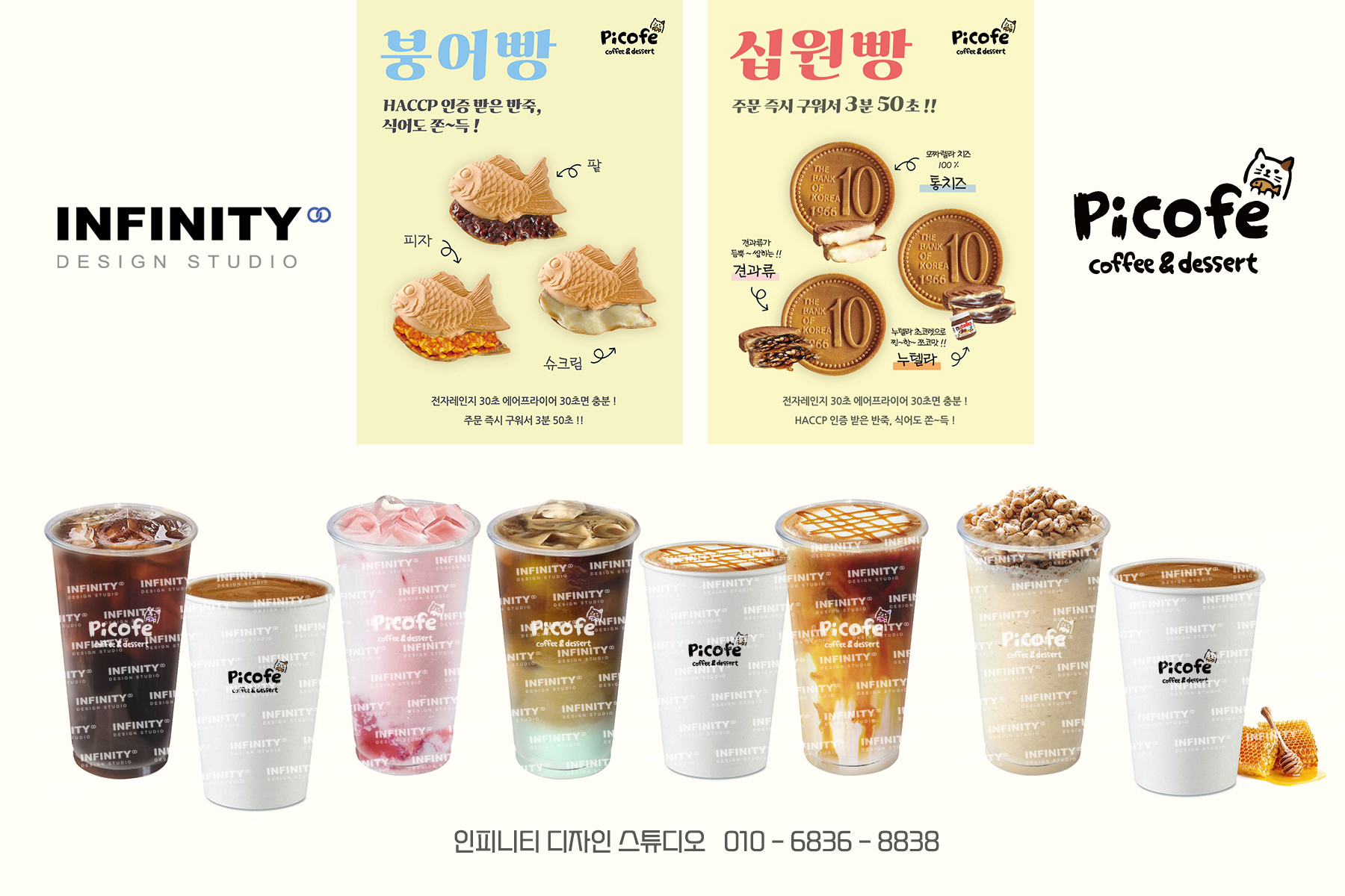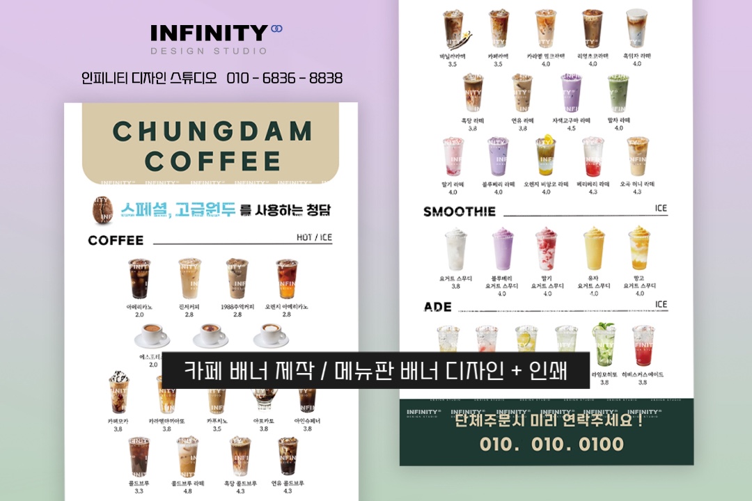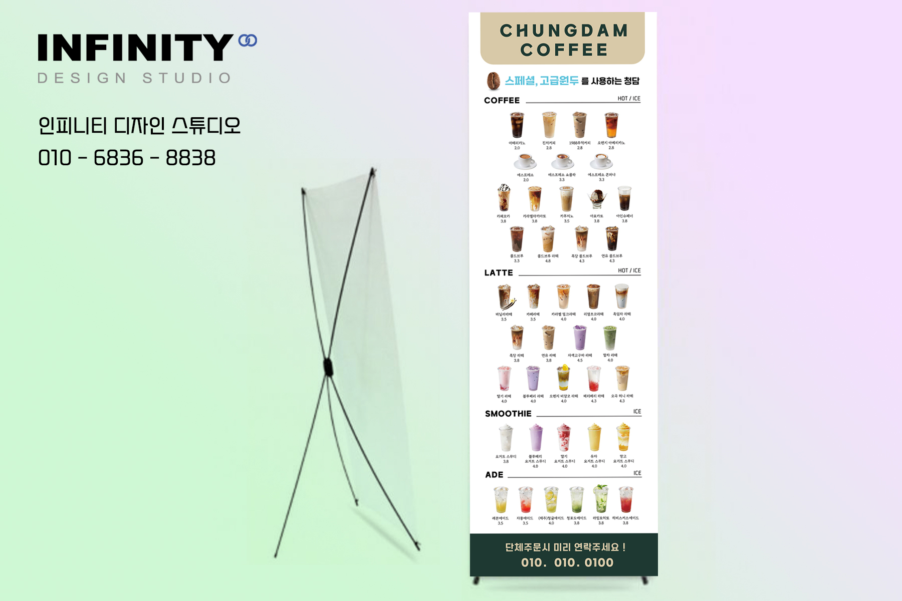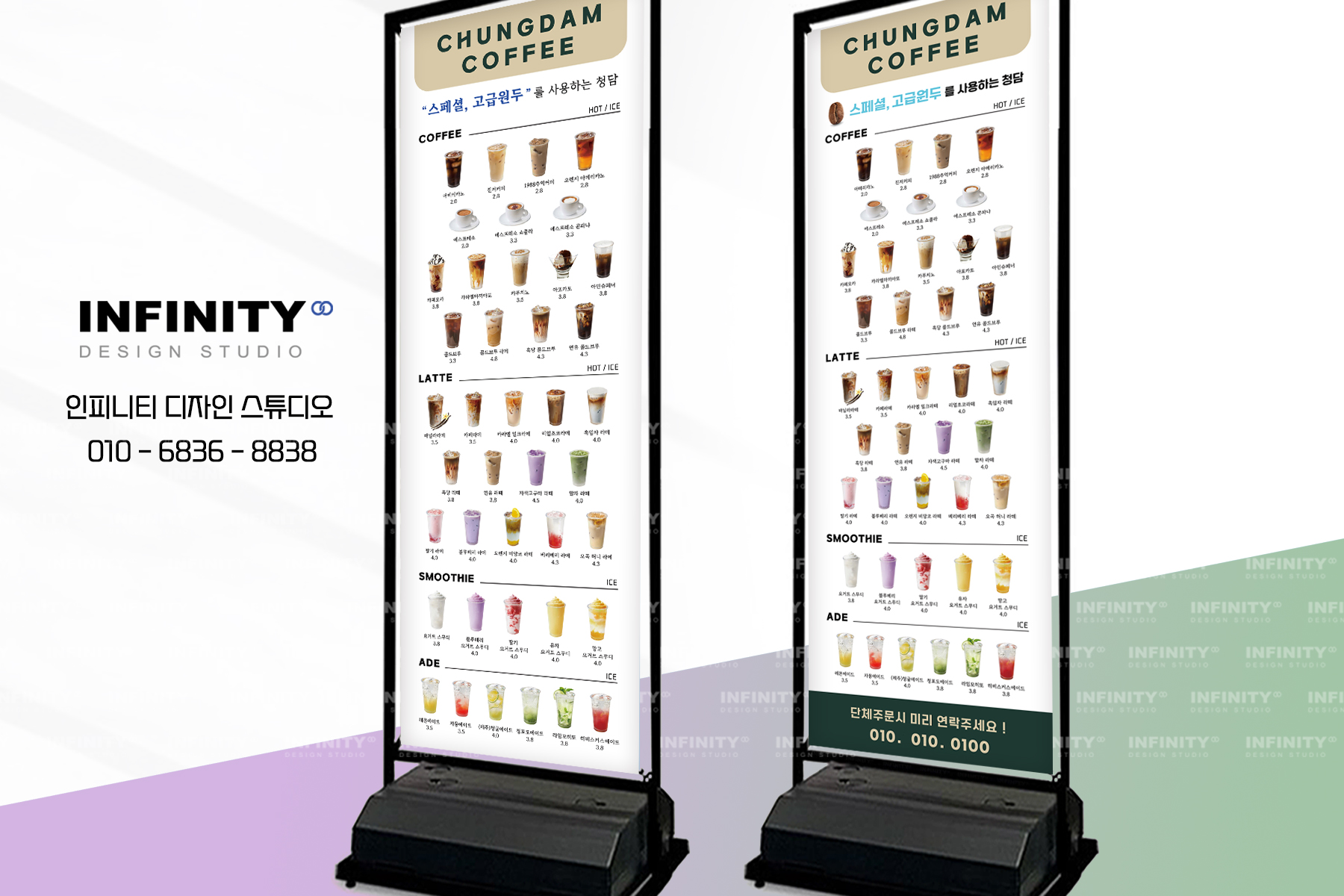 안녕하세요, 디자인, 제작 전문 인피니티 디자인 스튜디오 입니다. 프랜차이즈 카페 메뉴 촬영 대신 제작으로 완성! 배너, 메뉴판, 명함, 스티커 패키지 오늘은 서울 종로에 위치한 프랜차이즈