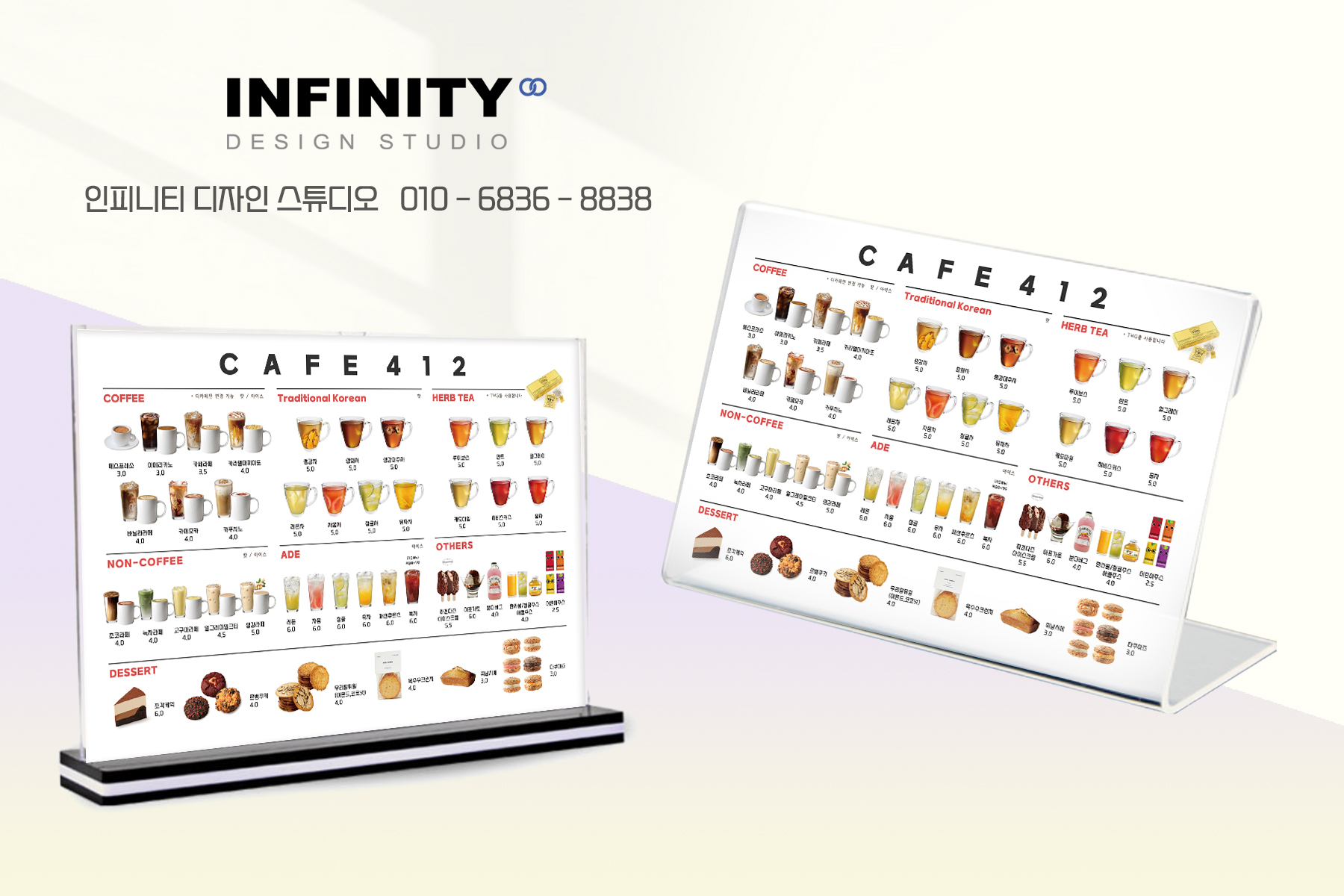 안녕하세요, 디자인, 제작 전문인피니티 디자인 스튜디오 입니다. 오늘은 세워두는 아크릴거치대 메뉴판소개 포스팅 드립니다. 음료 메뉴 구성과 디저트 메뉴 구성을나란히 두어 보기 좋게