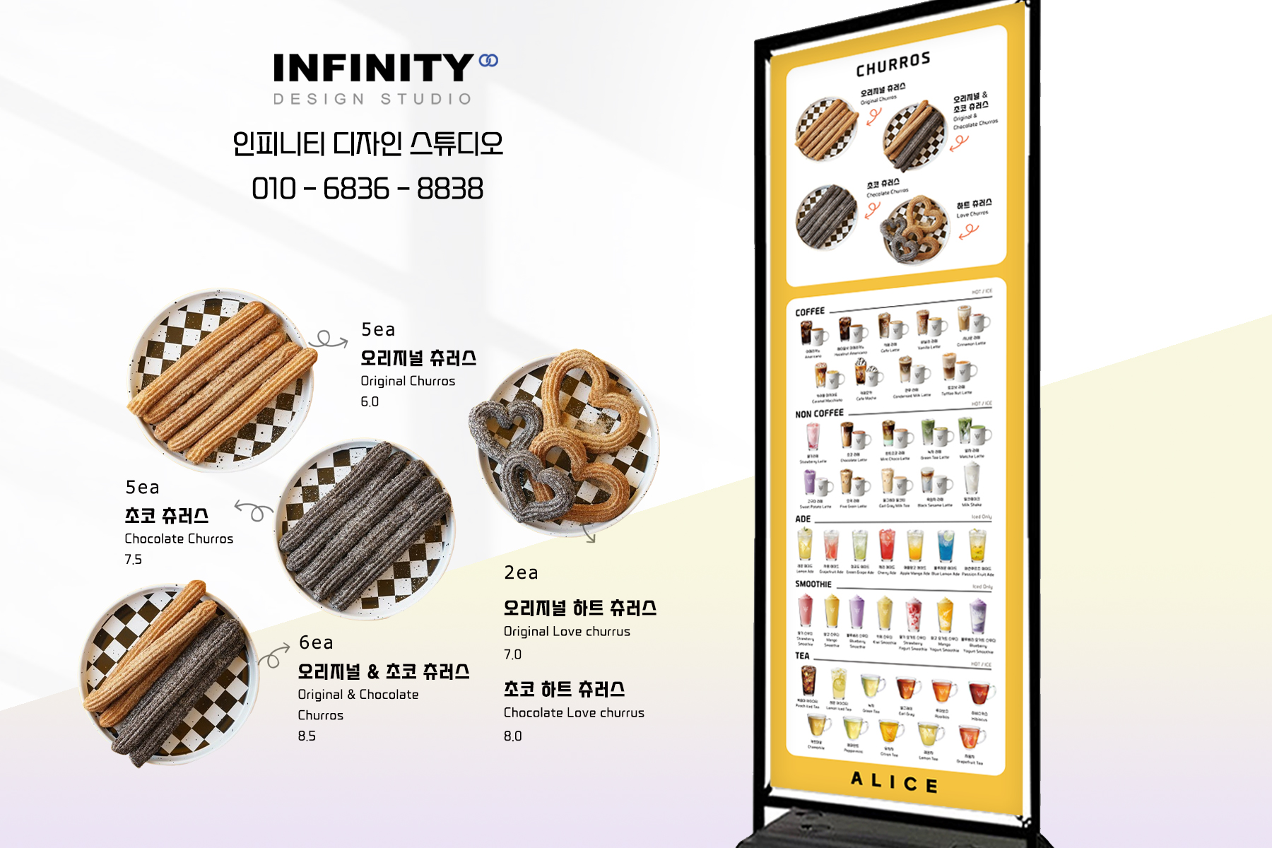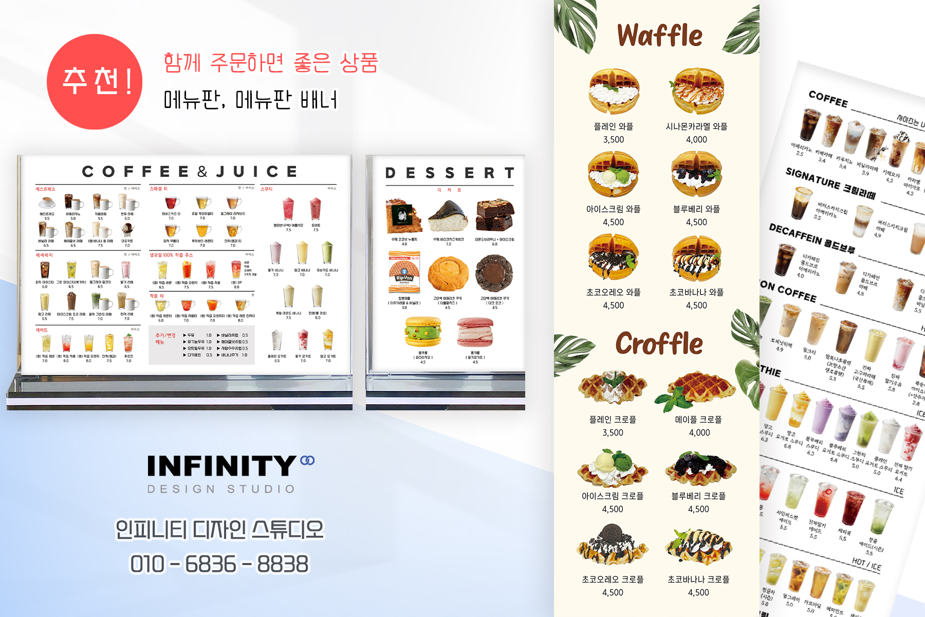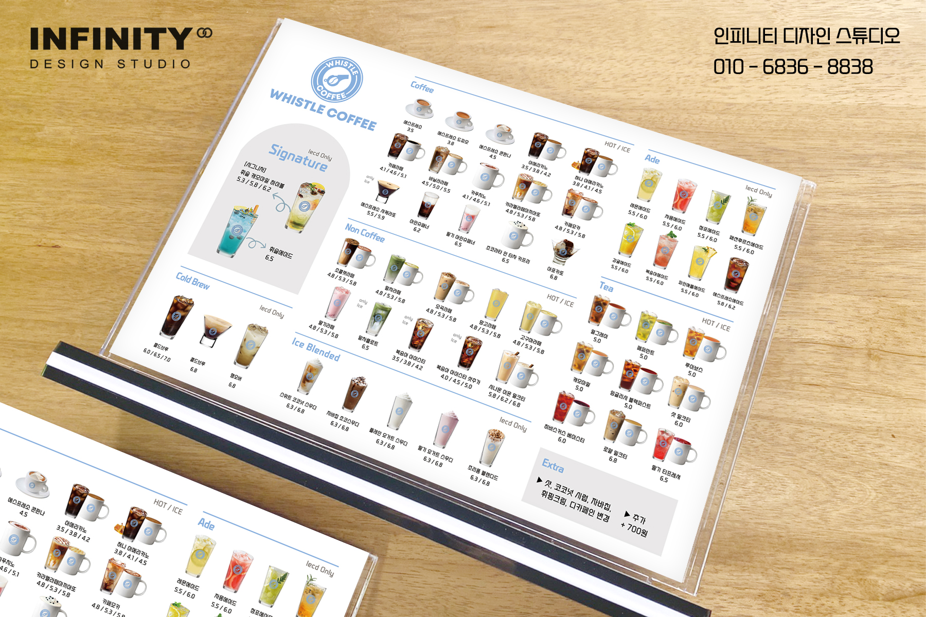 안녕하세요, 디자인, 제작 전문인피니티 디자인 스튜디오 입니다. 오늘은 카페 배너, 메뉴판 제작 소식포스팅 드립니다 :) 깔끔하게 정리된 메뉴판!우리카페 메뉴 소개와 메뉴, 가격 안내를한