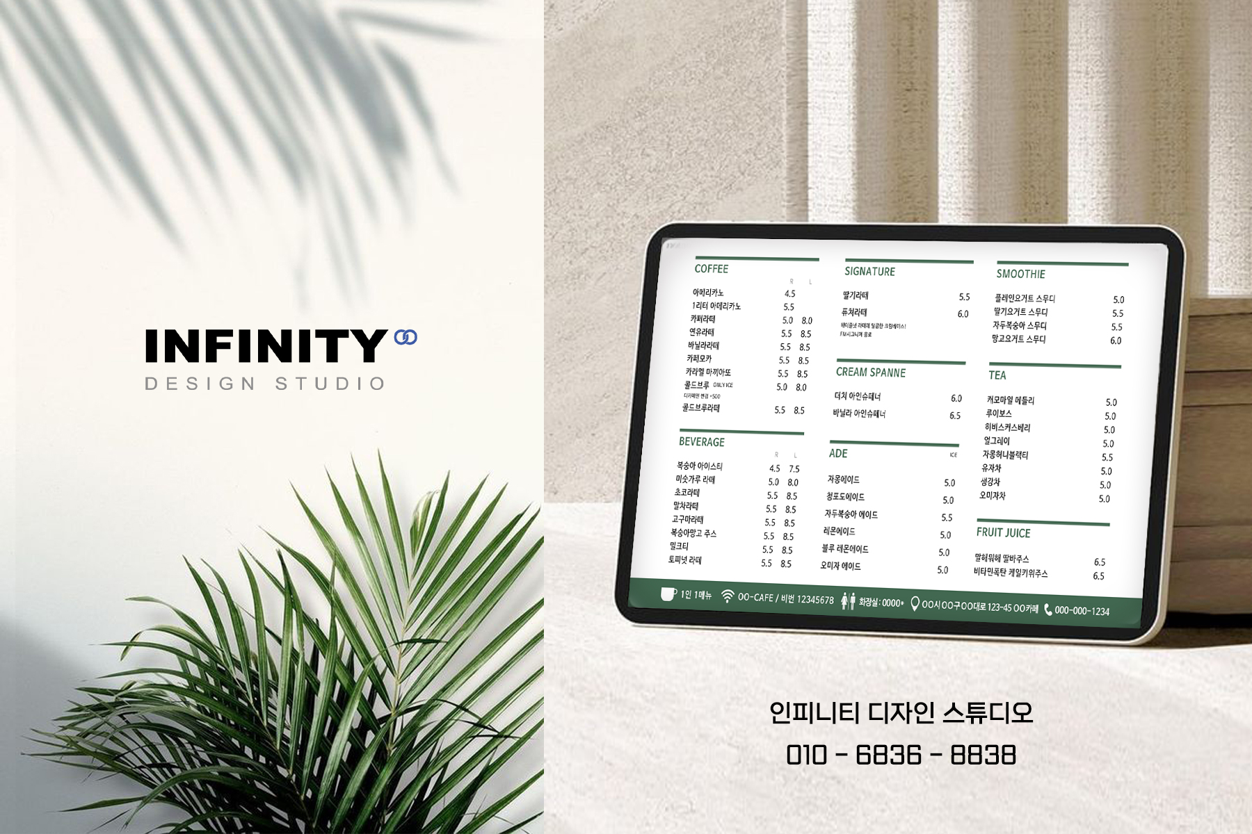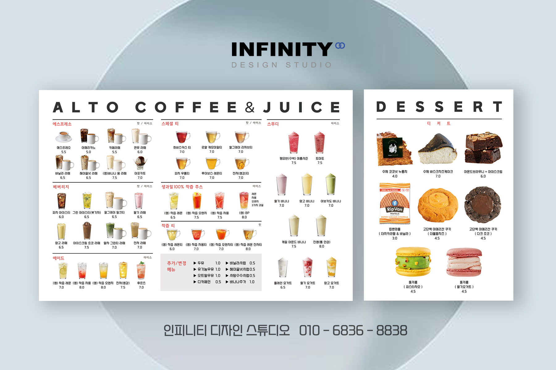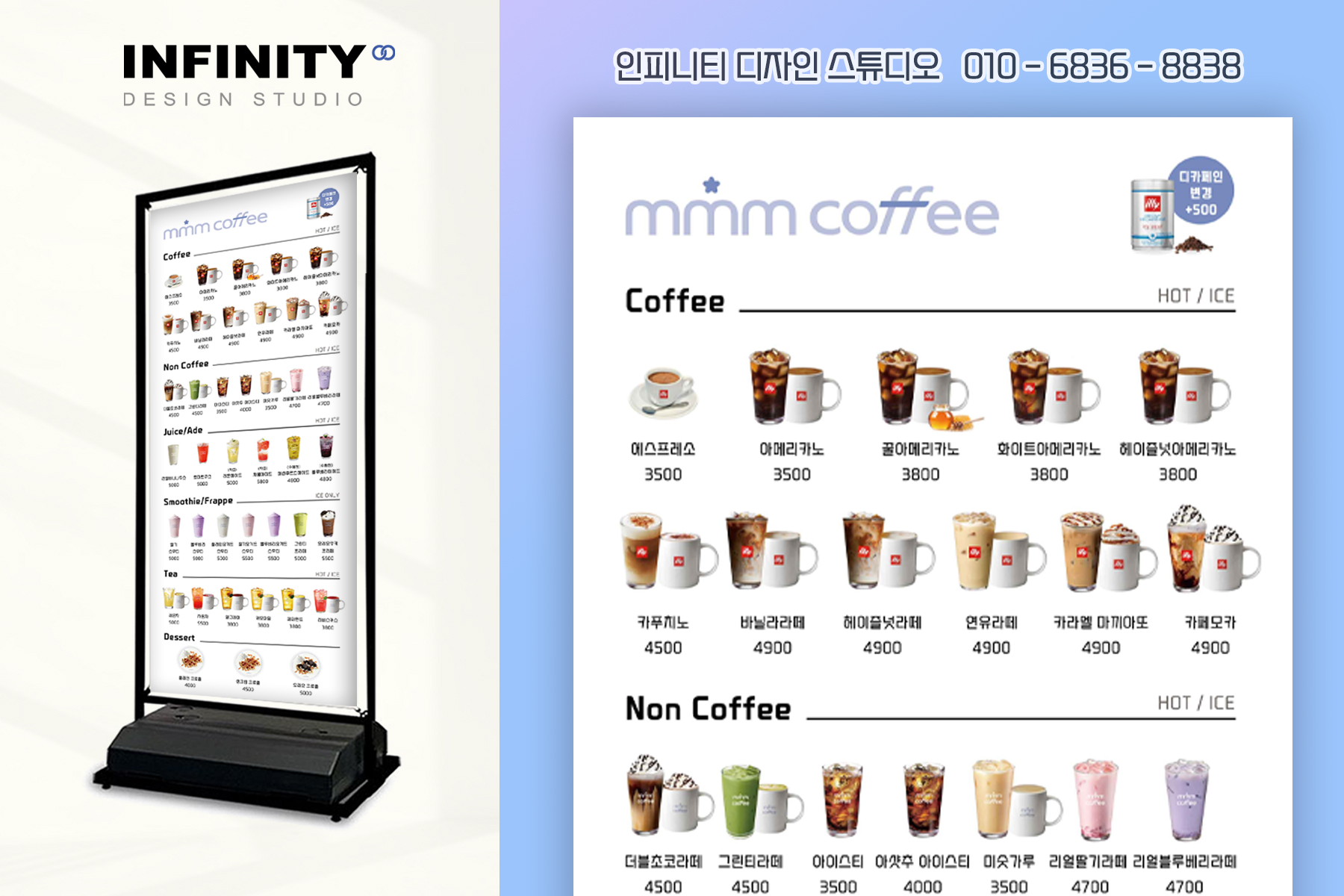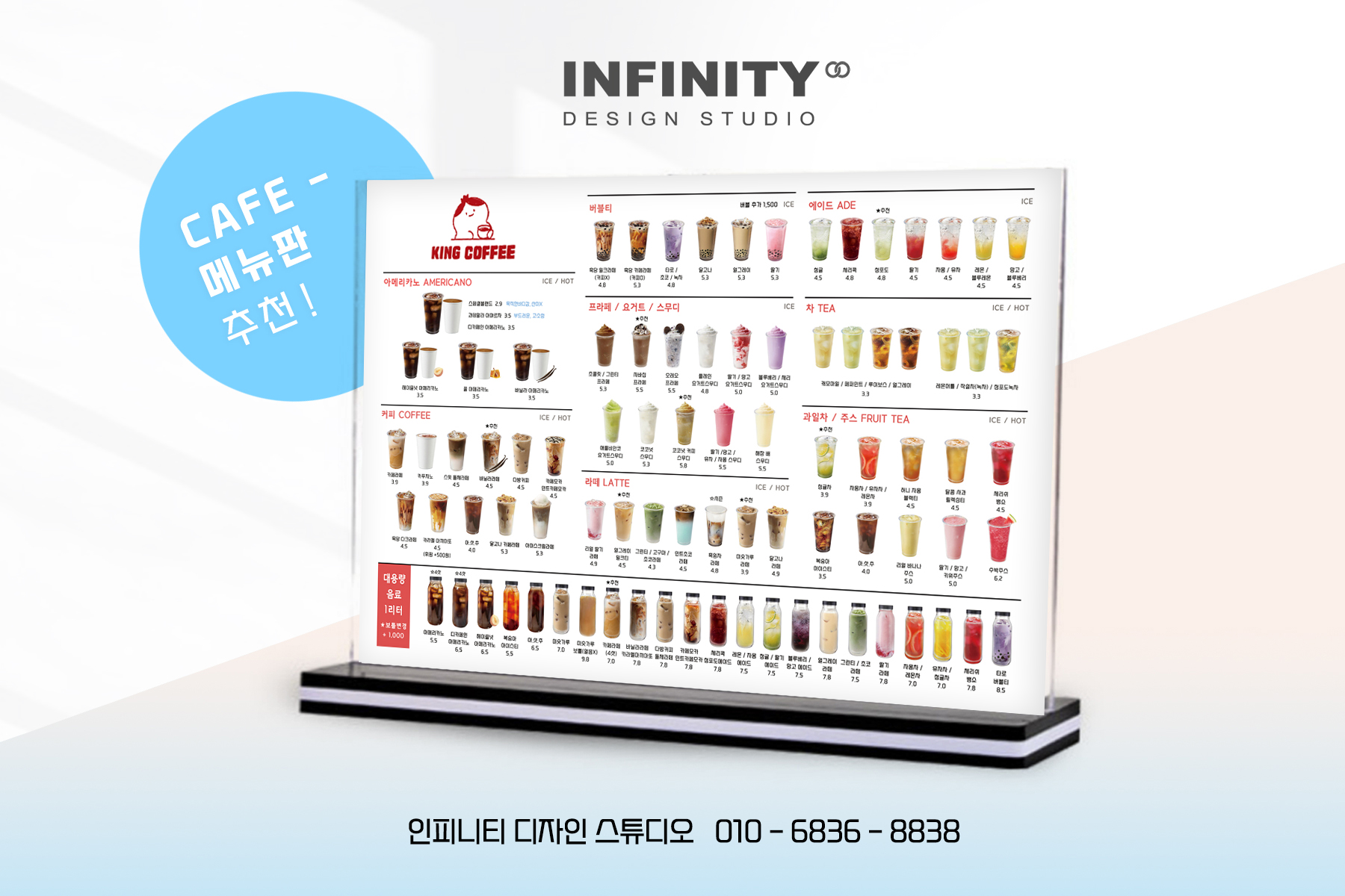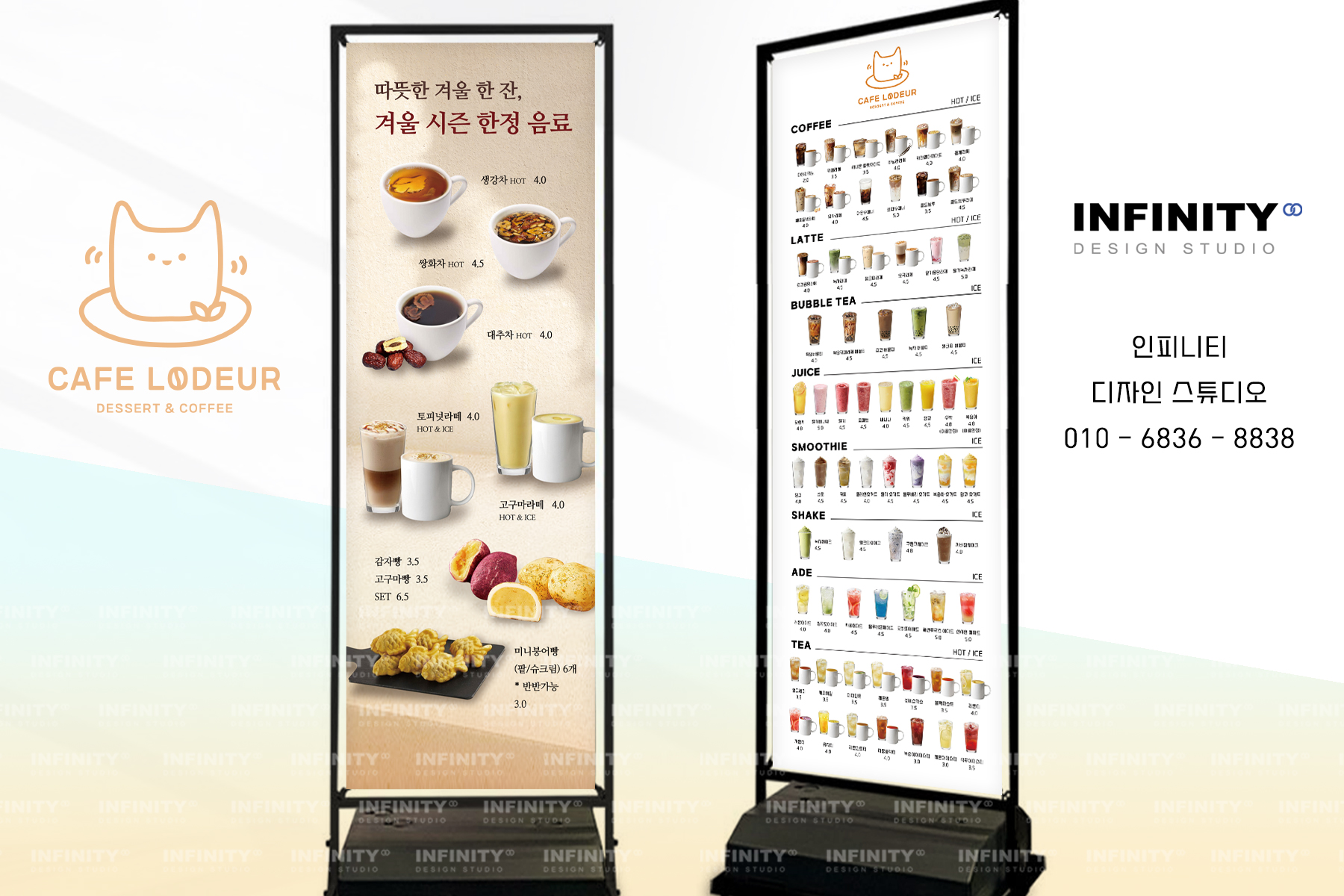 안녕하세요, 디자인, 제작 전문인피니티 디자인 스튜디오 입니다.오늘은 카페 메뉴판 배너 / 홍보 배너 제작 소식포스팅 준비했습니다 :) 다양한 우리 매장 메뉴를 담아홍보배너로 제작 완성 !