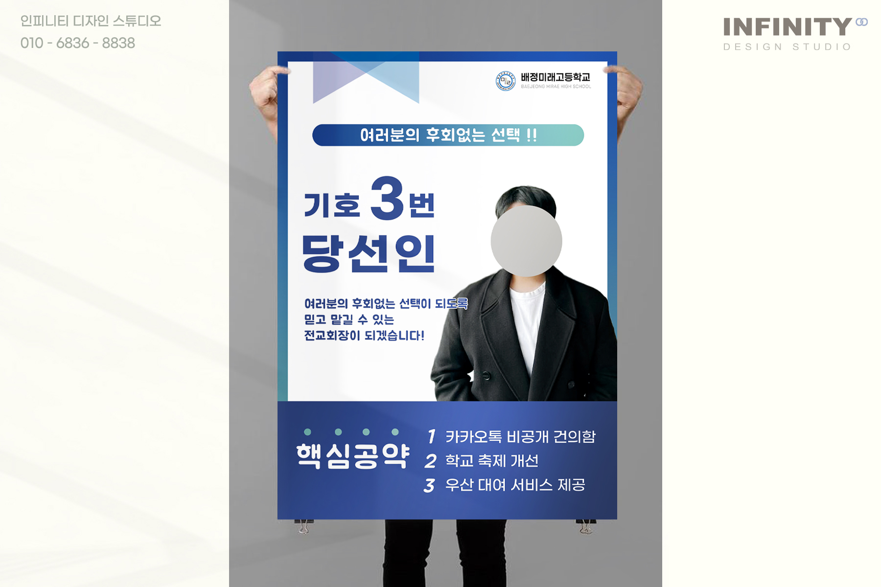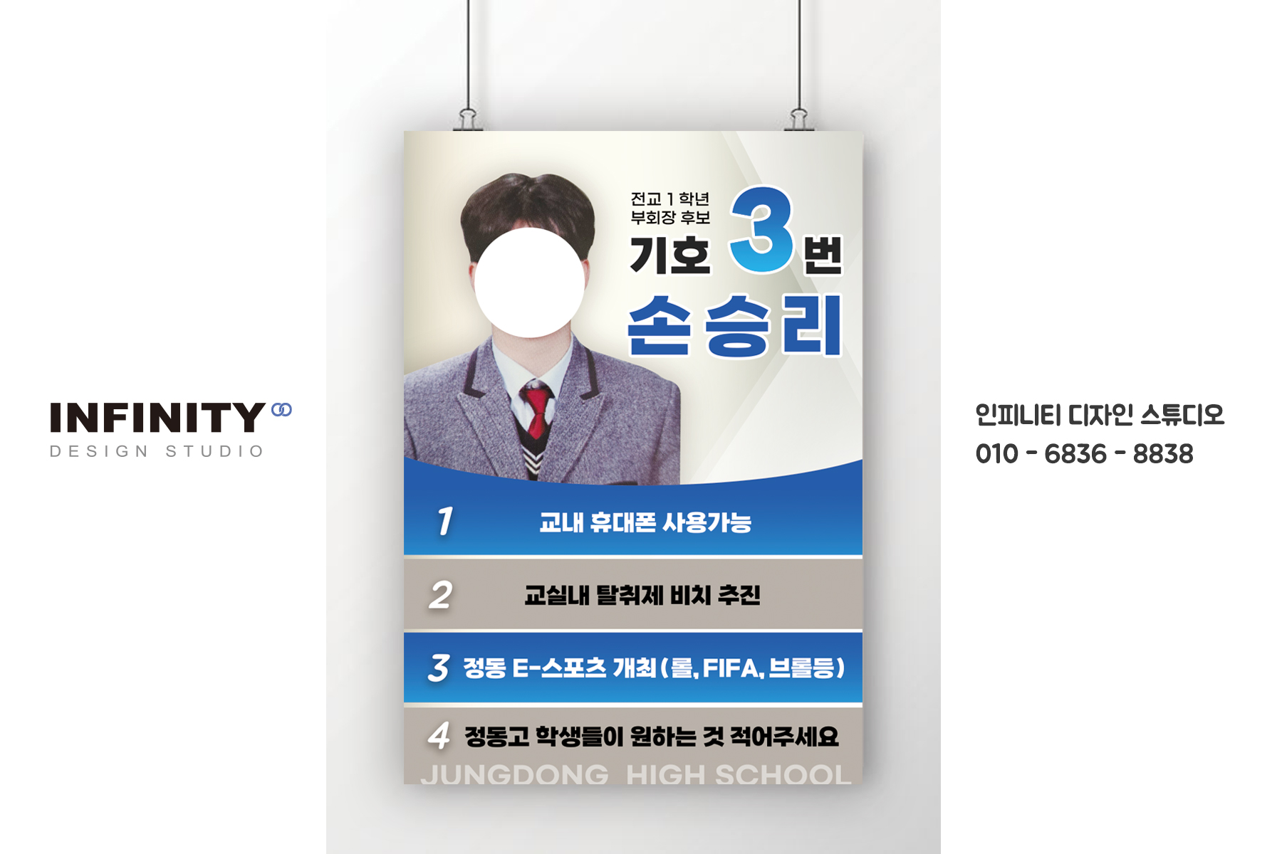 안녕하세요, 홍보물 디자인, 제작 전문인피니티 디자인 스튜디오 입니다. 고등학교 팀 선거포스터 제작,전교회장, 부회장 선거포스터 디자인, 인쇄포스팅 드립니다 :) 선거활동 준비로 바쁜 선