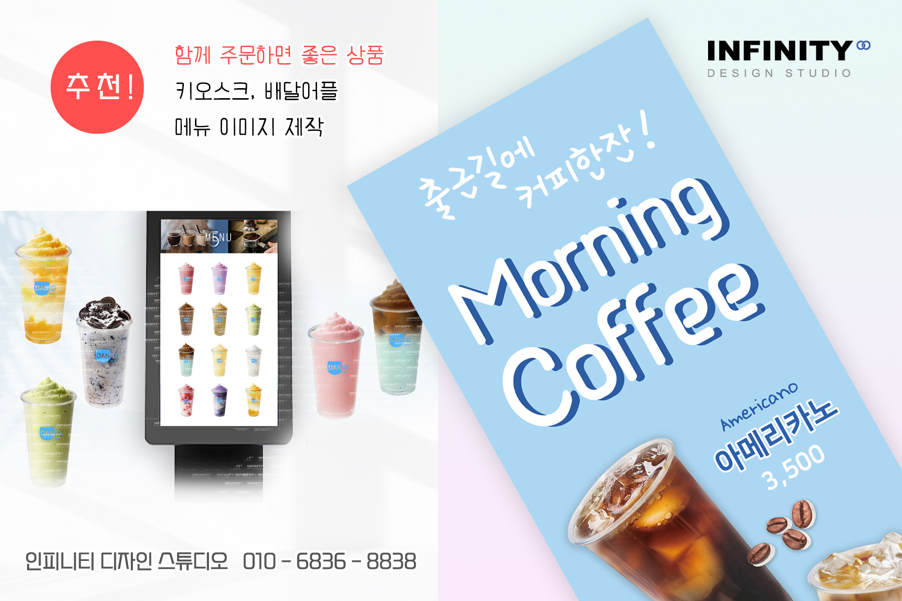 안녕하세요, 디자인, 제작 전문인피니티 디자인 스튜디오 입니다.오늘은 카페 키오스크 메뉴 사진 세트 제작,DID 메뉴판 디자인, 커피 사진 촬영제작소식 포스팅 드립니다 :) 우리카페에서 판