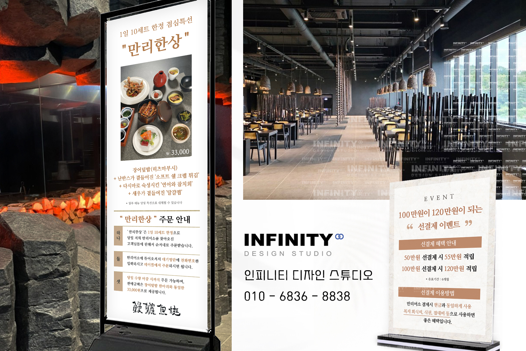 안녕하세요, 디자인, 제작 전문인피니티 디자인 스튜디오 입니다.오늘은 음식점 배너 제작 + 이벤트 홍보디자인, 인쇄, 제작 소식 포스팅 드립니다 :) 파주에 위치한 고급 레스토랑에 어울리는