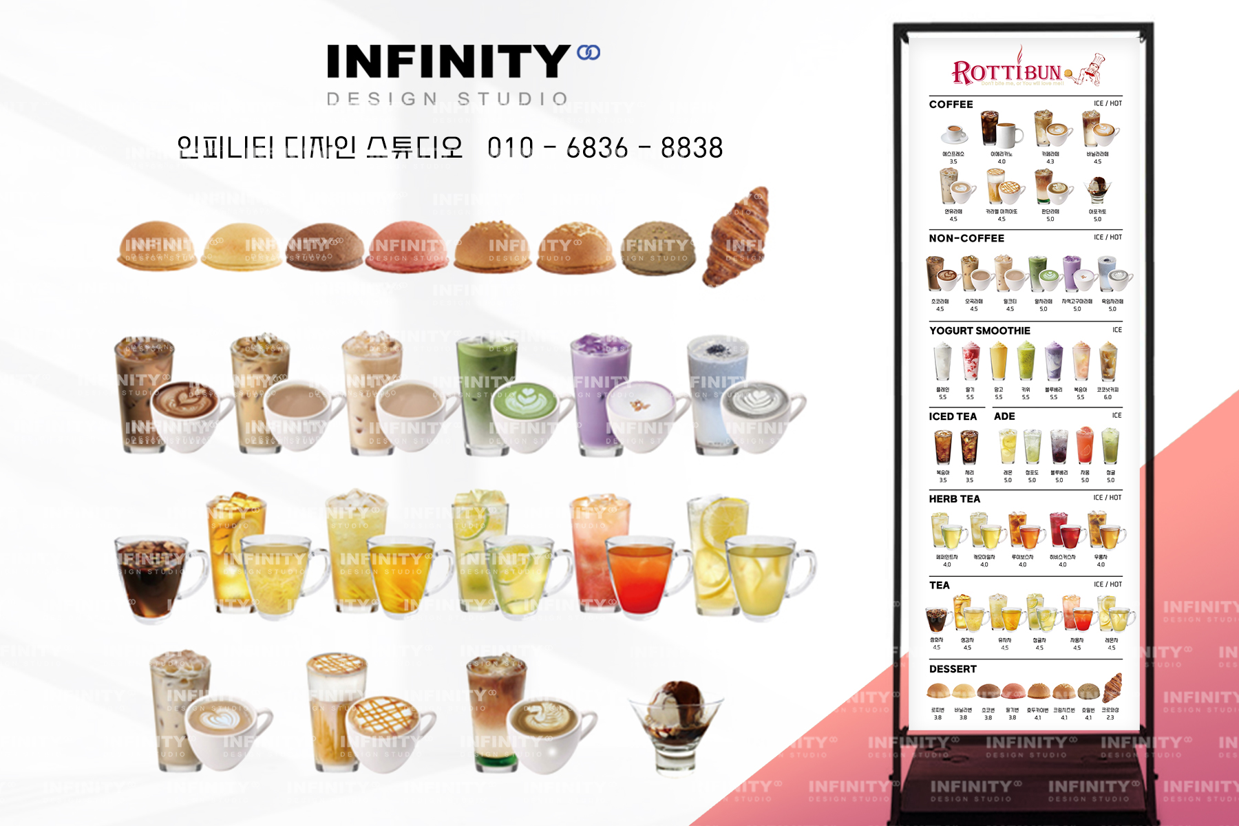 안녕하세요, 디자인, 제작 전문인피니티 디자인 스튜디오 입니다.오늘은 카페 오픈 준비로 진행된키오스크 메뉴사진 촬영 제작, 메뉴판 배너 제작소식 포스팅 드립니다 카페오픈, 운영중 필
