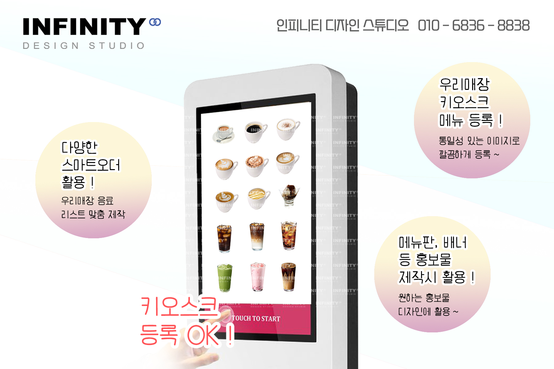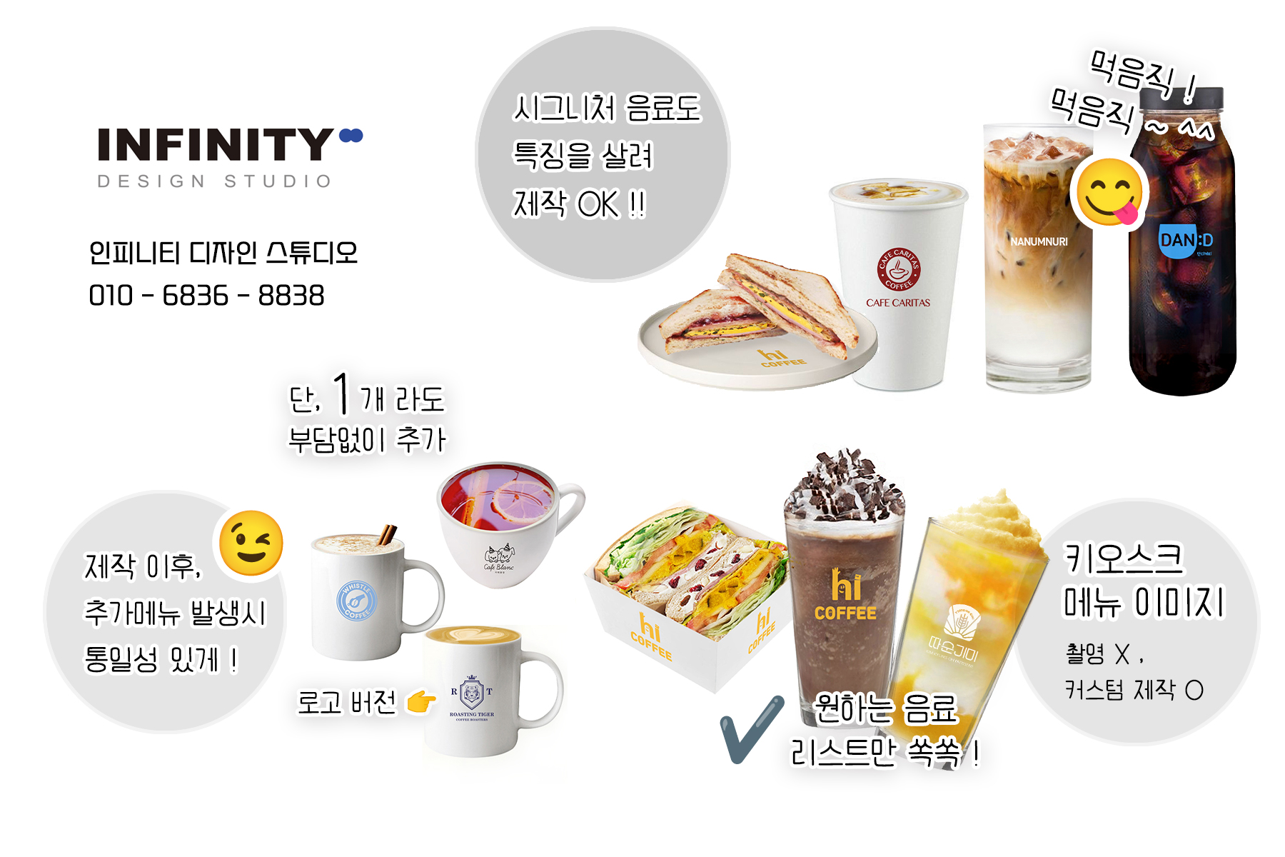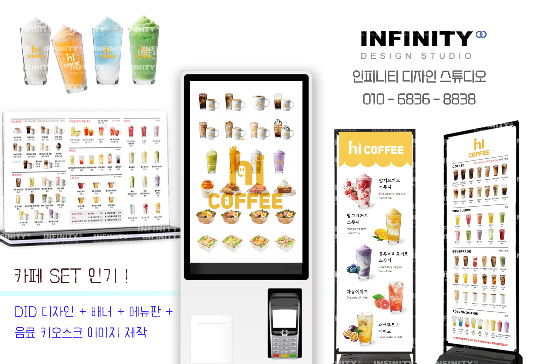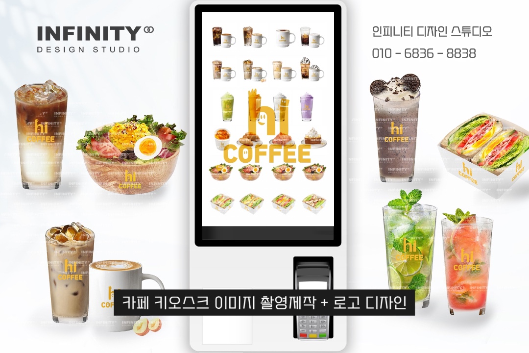 안녕하세요, 디자인, 제작 전문인피니티 디자인 스튜디오 입니다. 오늘은 카페 오픈 준비로 진행된카페 키오스크 메뉴이미지 제작과 배너, DID, 메뉴판 등 다양한 품목 진행소식 드립니다 :) 먼저
