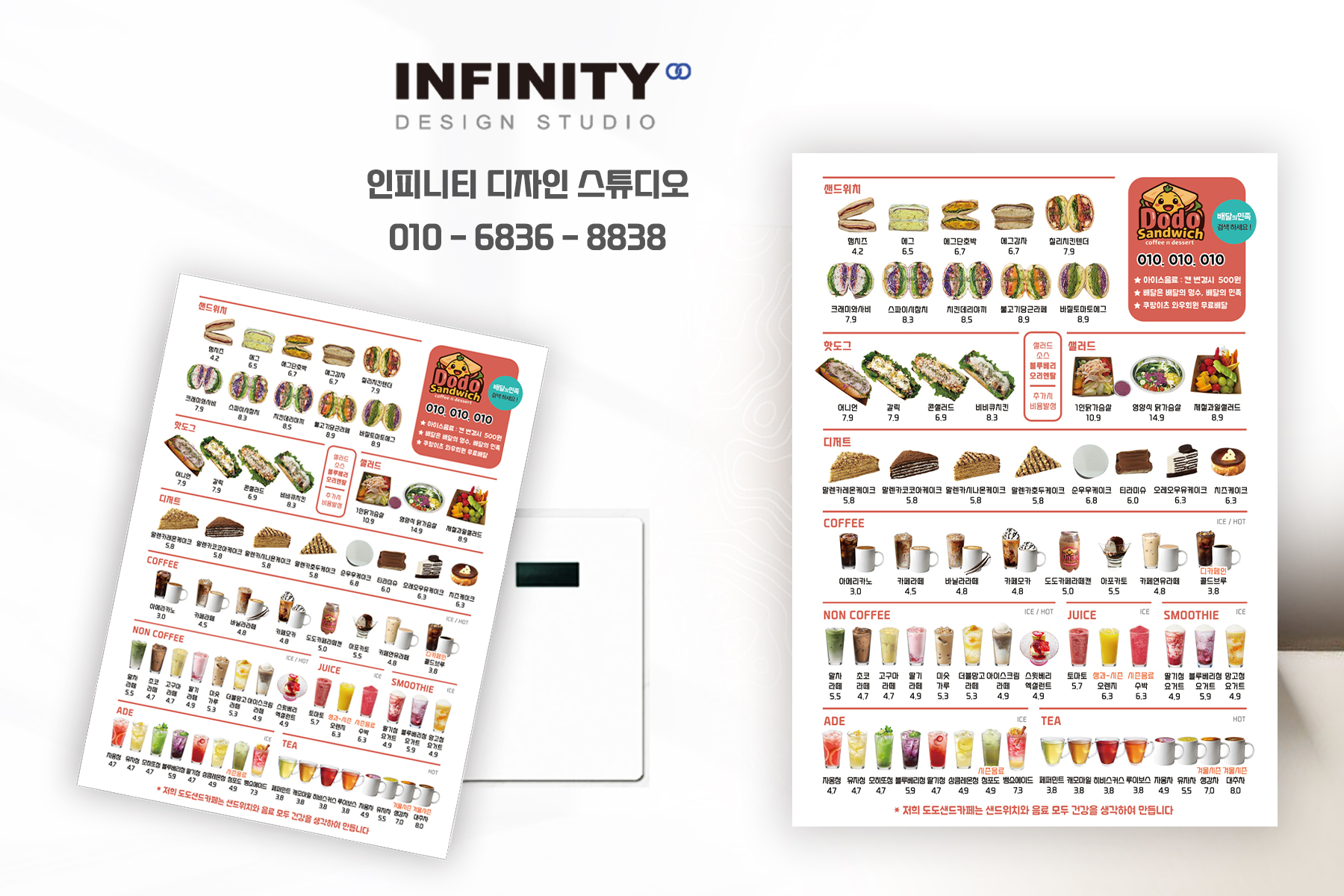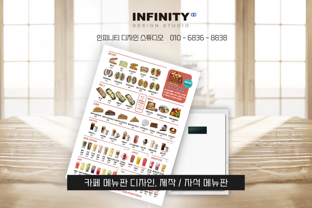 안녕하세요, 디자인, 제작 전문인피니티 디자인 스튜디오 입니다. 오늘은 카페 오픈 준비로 진행된카페 키오스크 메뉴이미지 제작과 배너, DID, 메뉴판 등 다양한 품목 진행소식 드립니다 :) 먼저