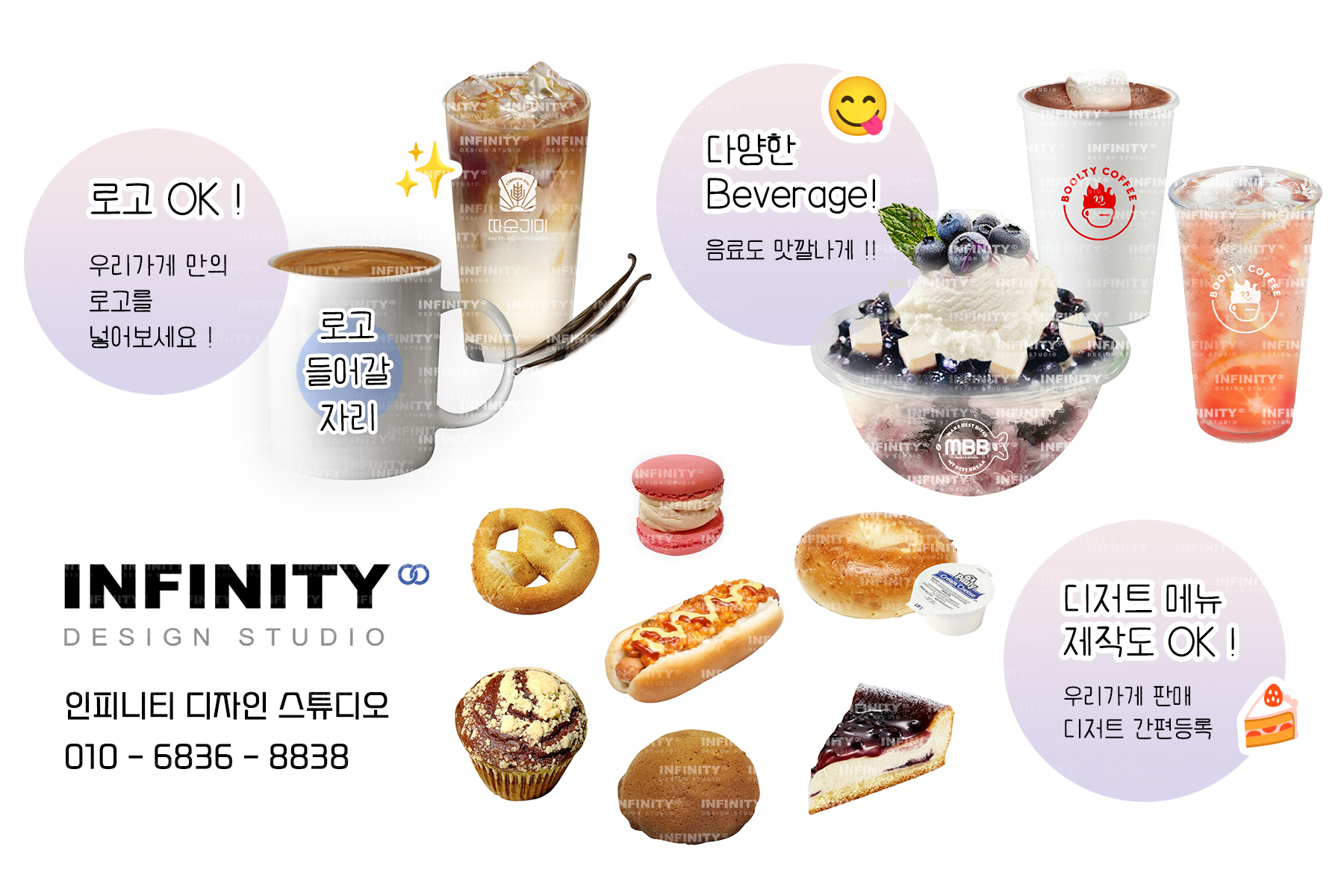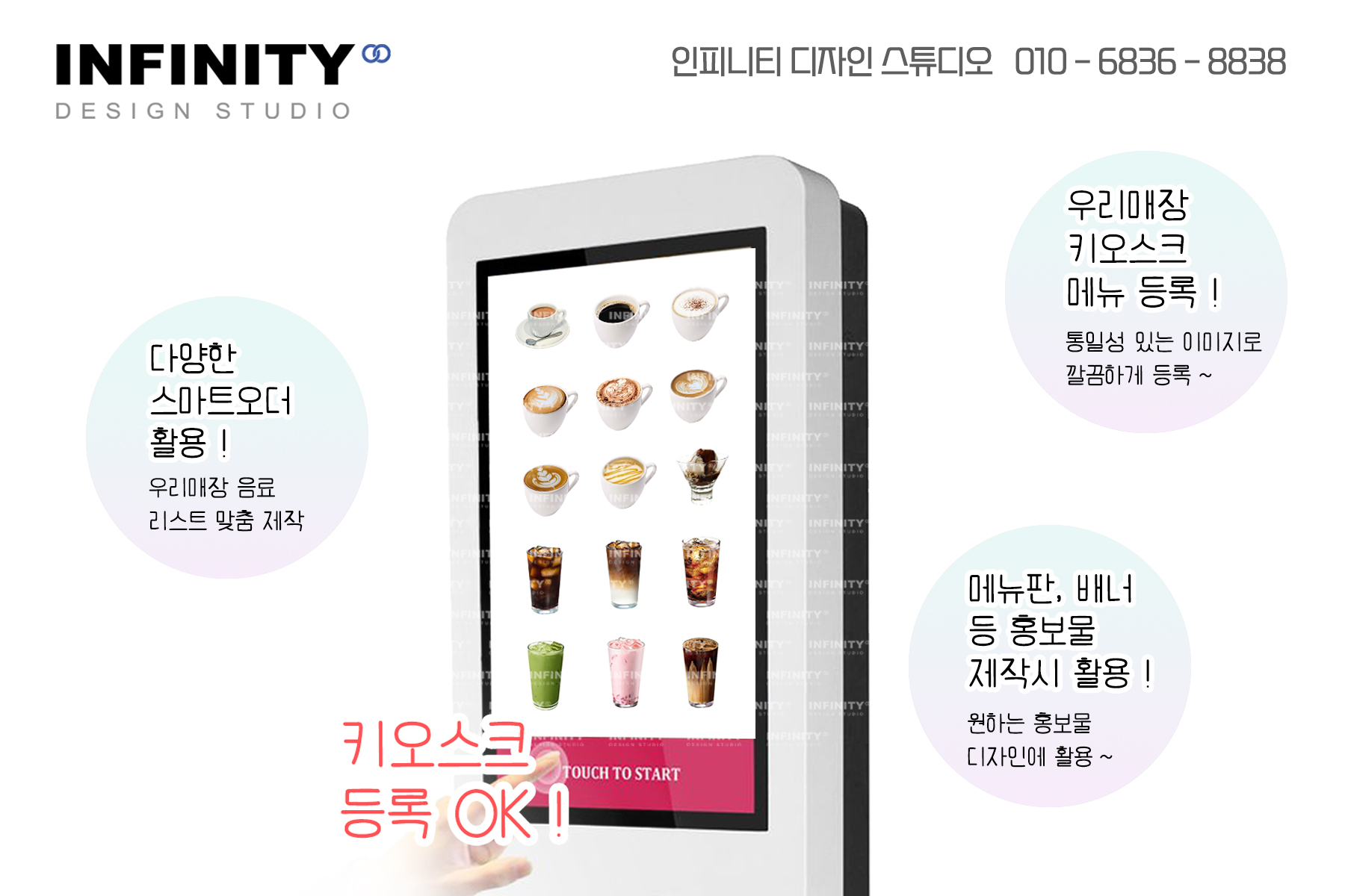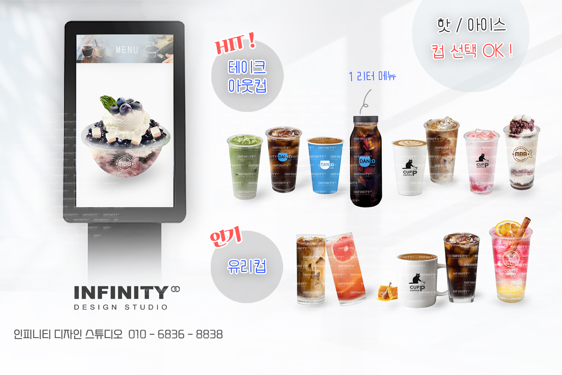 안녕하세요, 디자인, 제작 전문인피니티 디자인 스튜디오 입니다. 오늘은 카페 오픈 준비로 진행된카페 키오스크 메뉴이미지 제작과 배너, DID, 메뉴판 등 다양한 품목 진행소식 드립니다 :) 먼저