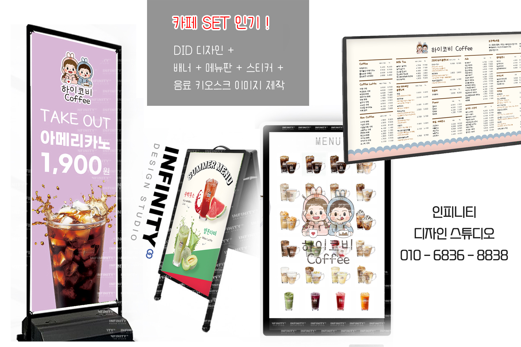여러분 안녕하세요!디자인, 제작 전문인피니티 디자인 스튜디오 입니다 :)오늘은 최근 진행한카페 DID 디자인 및 메뉴판 제작소식을 전해드리려고 해요.⠀ 요즘 카페를 창업하거나 리뉴얼하시는