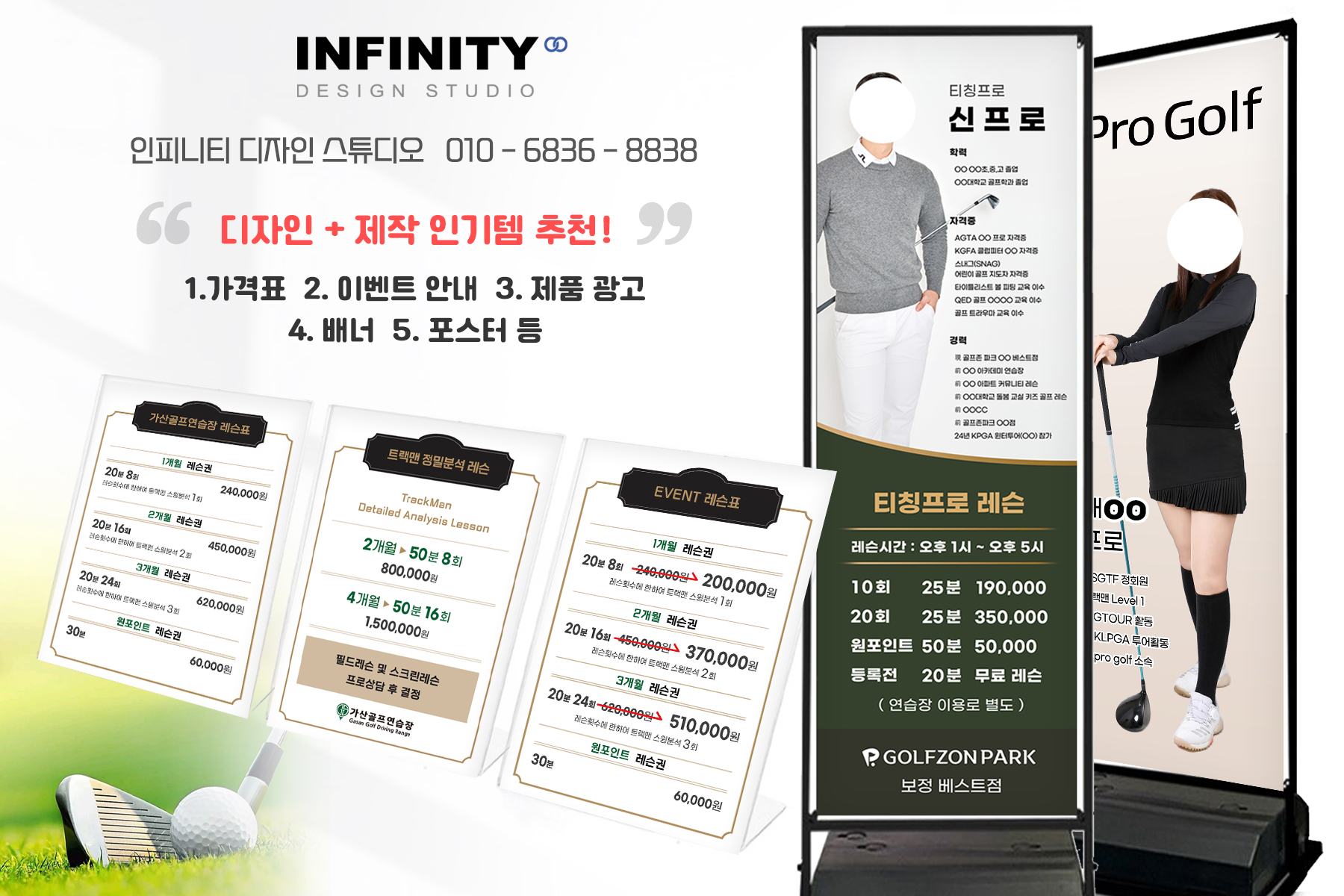 골프장 배너, 명함 제작, 골프 레슨 배너, 골프장 프로필액자, 프로그램 안내 메뉴판