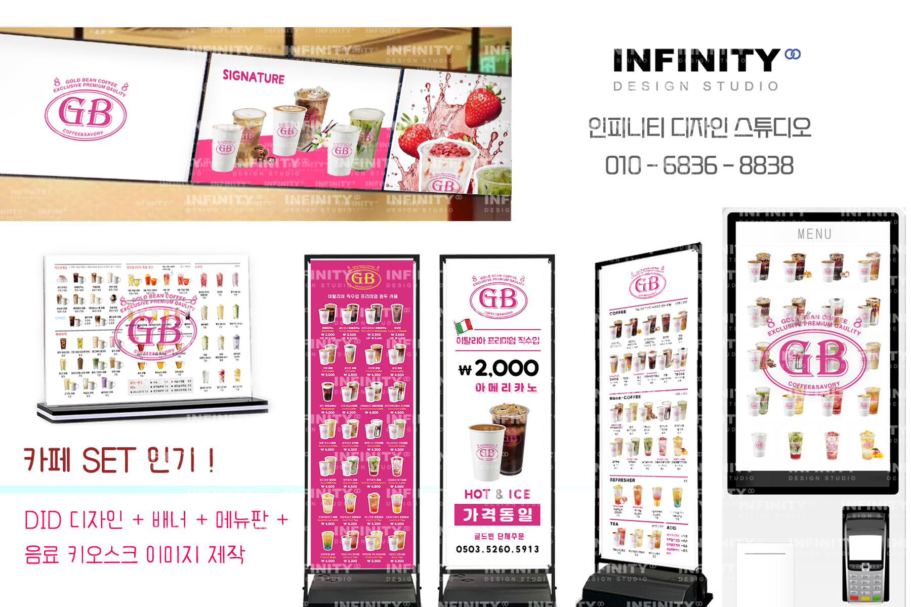 안녕하세요, 디자인, 제작 전문인피니티 디자인 스튜디오 입니다 :)카페 오픈준비중, 운영중 필요한 홍보물추천 포스팅 드립니다 키오스크 사진세트와메뉴판, 배너 등 필요한 홍보물도함께 진