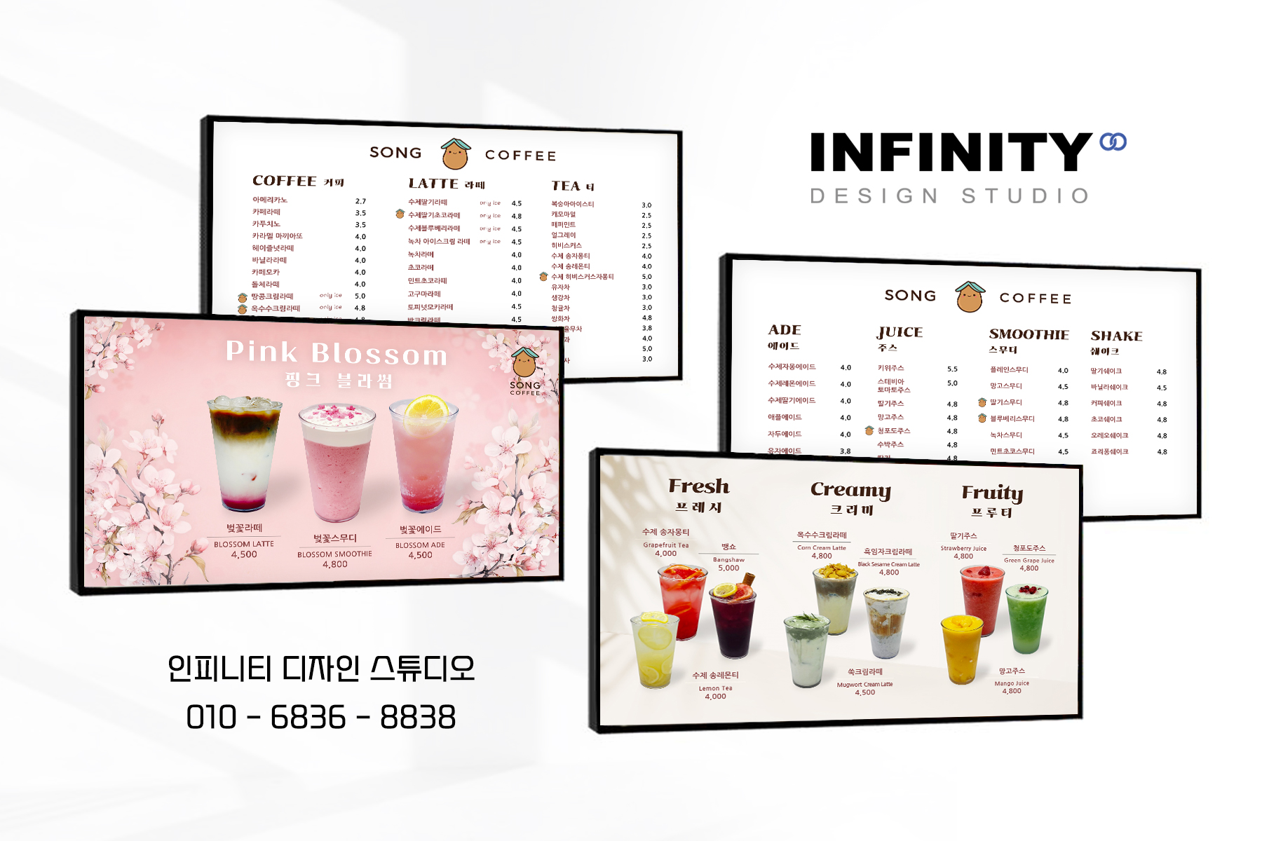 안녕하세요, 디자인, 제작 전문인피니티 디자인 스튜디오 입니다 :)오늘은 카페 LED메뉴판 디자인 소식포스팅 드립니다 ! 카페 운영 중 많이 활용하는 모니터 메뉴판3개 구성으로 맞춤 디자인해