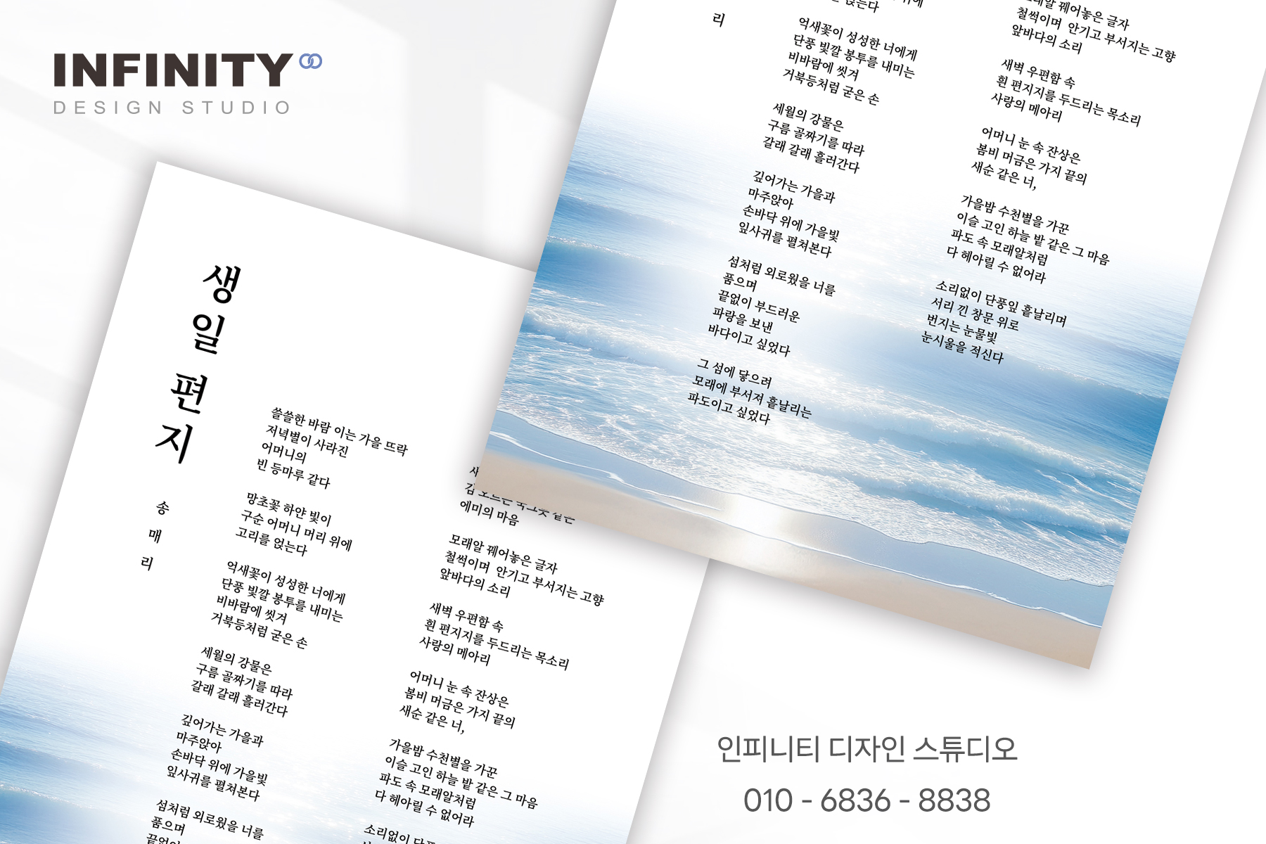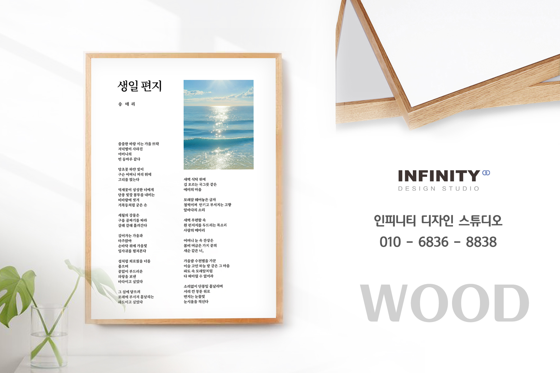 안녕하세요, 디자인, 제작 전문인피니티 디자인 스튜디오 입니다 :)오늘은 시액자 제작 소식 포스팅 드립니다 시 작품 액자로 의뢰해주셔서원하는 사이즈와 수량으로 제작해드렸습니다 시와 어