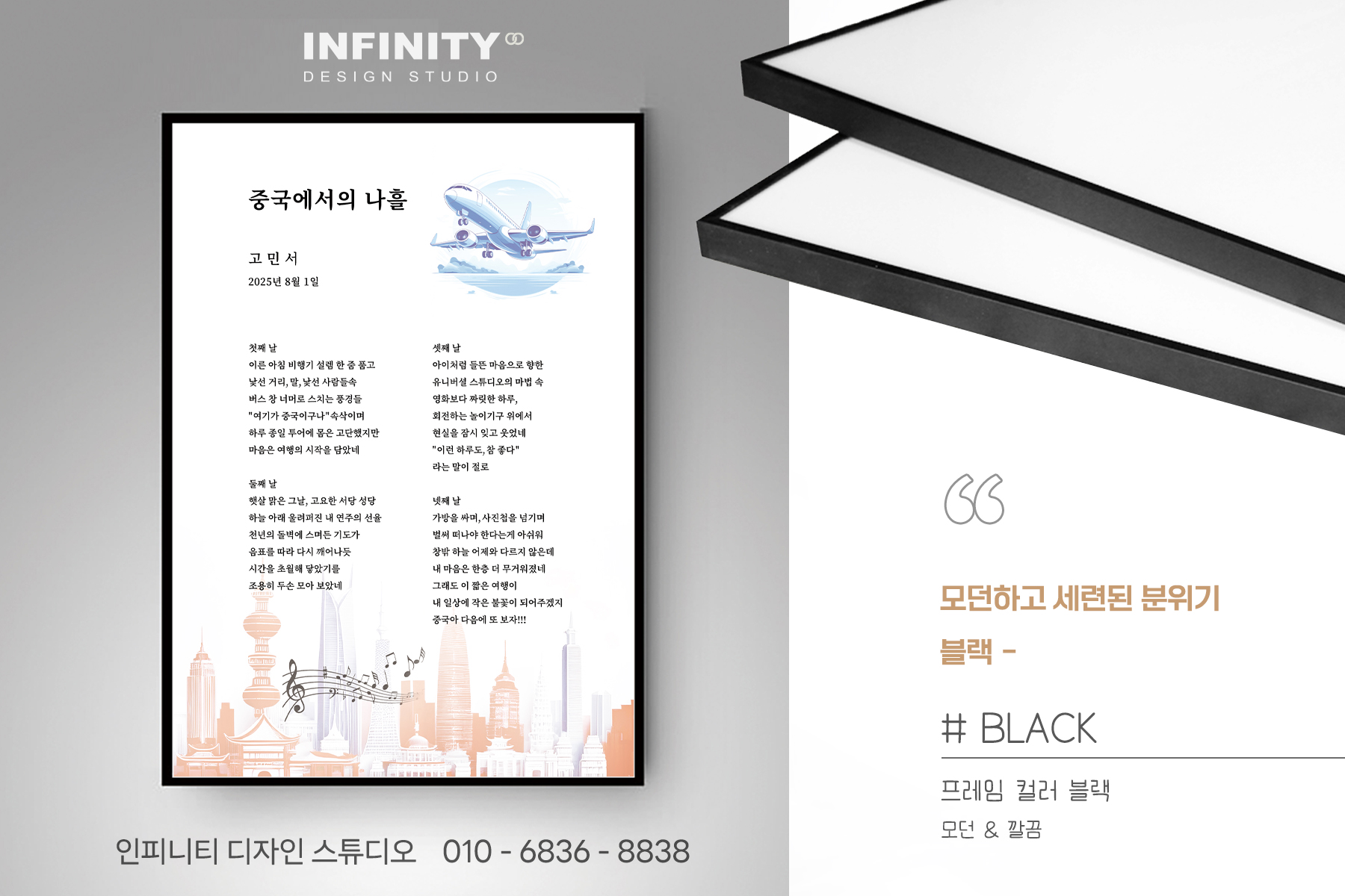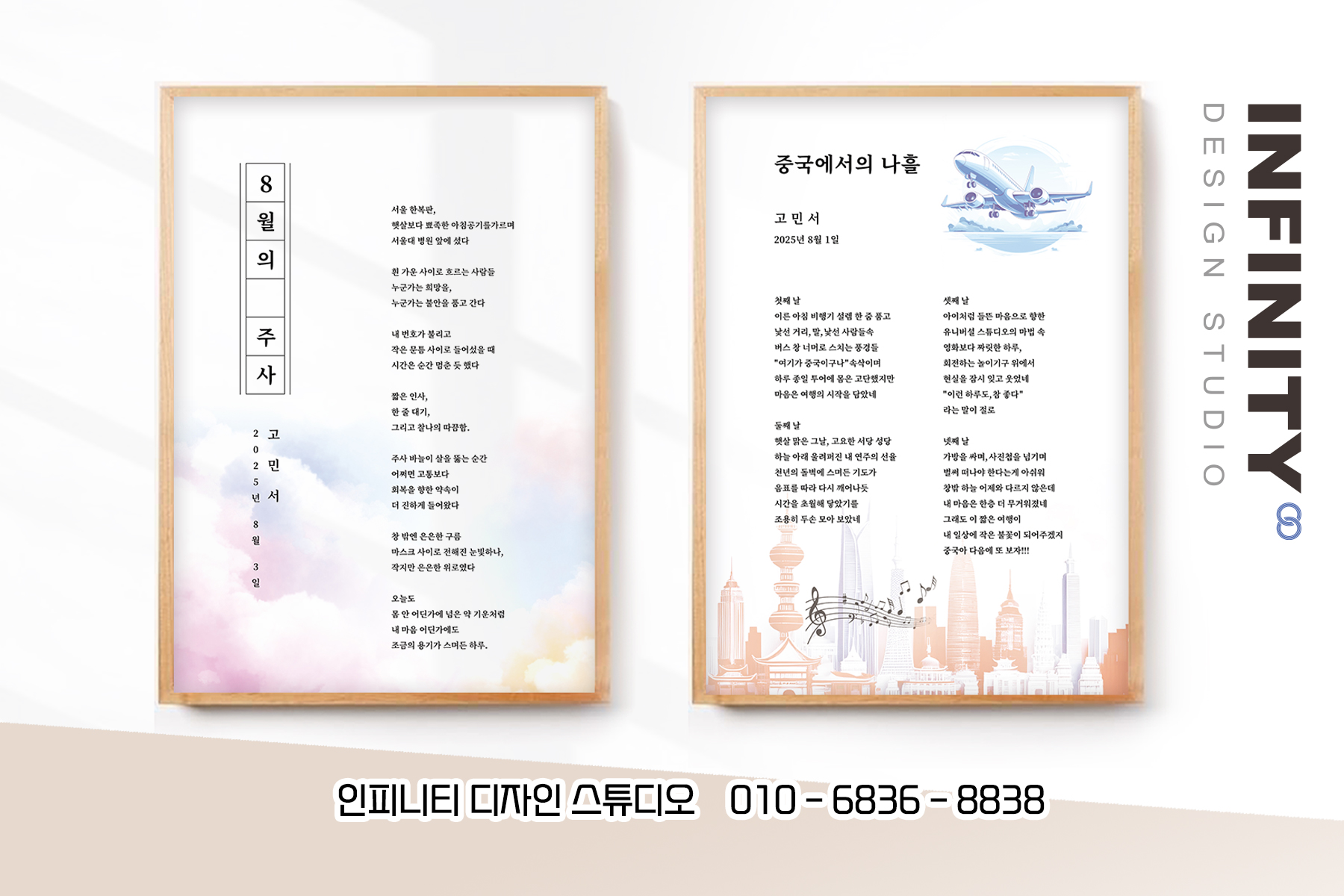 안녕하세요, 디자인, 제작 전문인피니티 디자인 스튜디오 입니다 :)오늘은 시액자 제작 소식 포스팅 드립니다 시 작품 액자로 의뢰해주셔서원하는 사이즈와 수량으로 제작해드렸습니다 시와 어