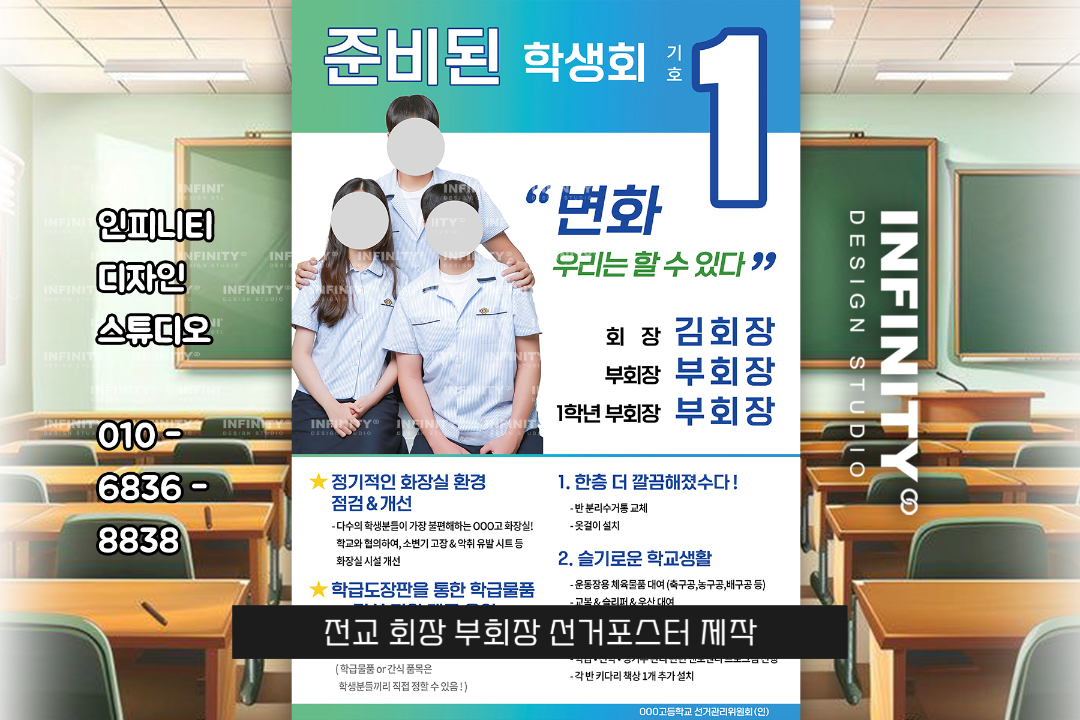 안녕하세요, 디자인, 제작 전문인피니티 디자인 스튜디오 입니다 :)오늘은 전교회장 선거 포스터, 피켓, 어깨띠진행 소식 포스팅 드려요 학생 전교회장 선거 포스터 디자인, 제작,전교회장 부회