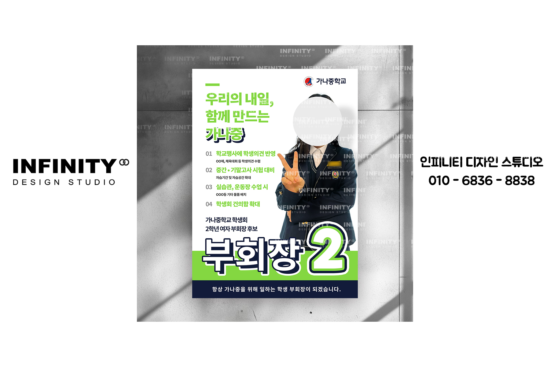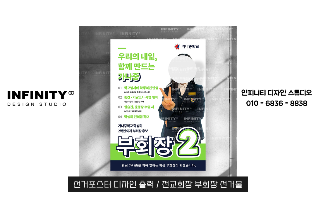 안녕하세요, 디자인·제작 전문 인피니티 디자인 스튜디오입니다 😊전교회장 선거 준비로 한창 바쁘신가요?선거 포스터와 피켓 제작,디자인부터 인쇄, 배송까지 한 번에 해결해 드립니다. 전교