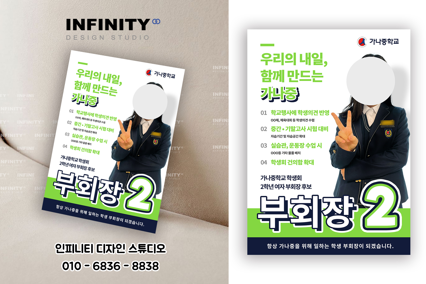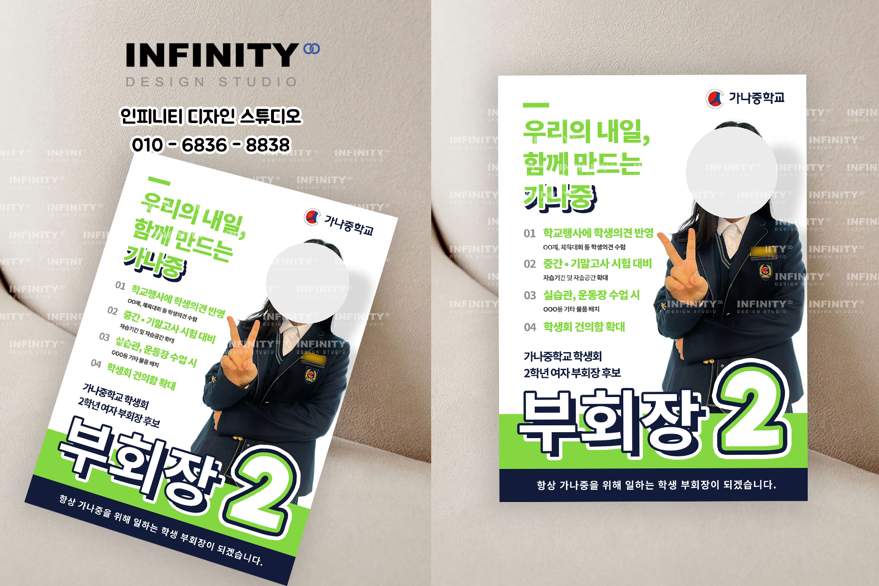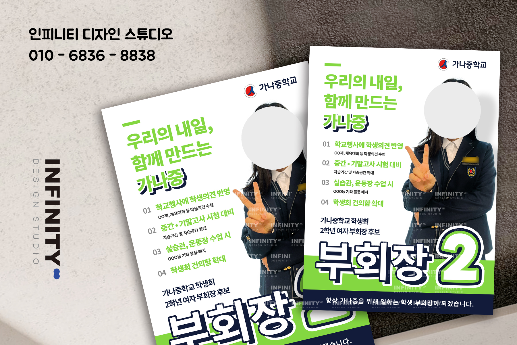 안녕하세요, 디자인, 제작 전문인피니티 디자인 스튜디오 입니다.오늘은 학생회장 선거준비,중학교 전교부회장 선거포스터, 피켓 제작소식 포스팅 준비했어요 :) 서울강남구/서초에서 의뢰해