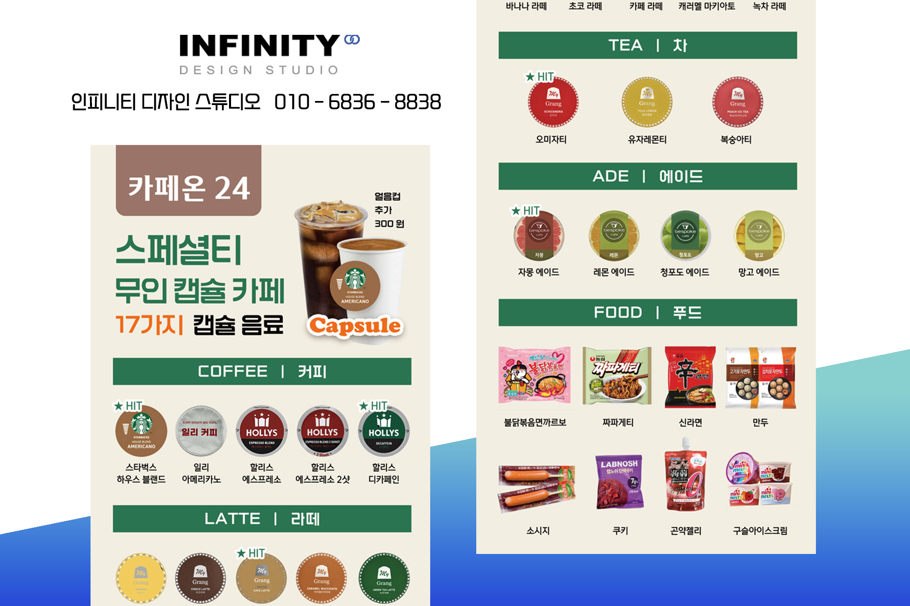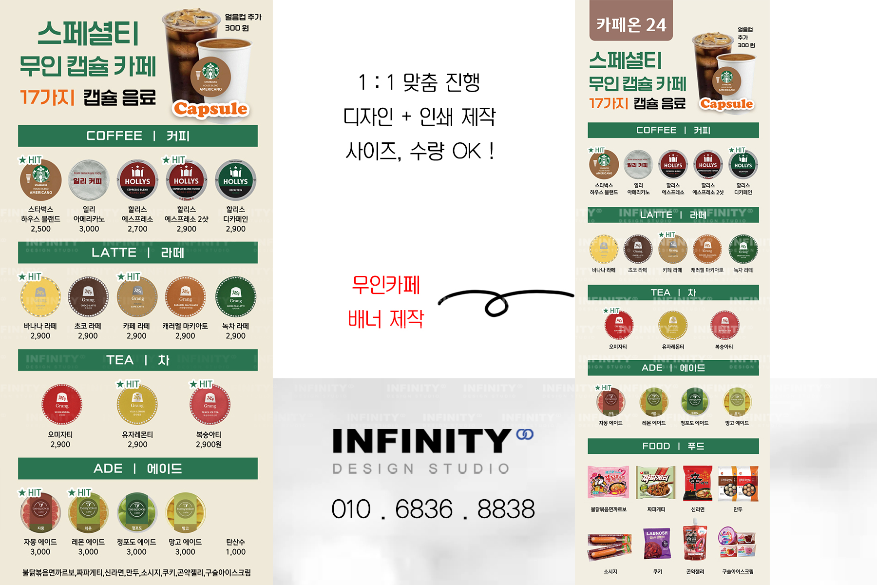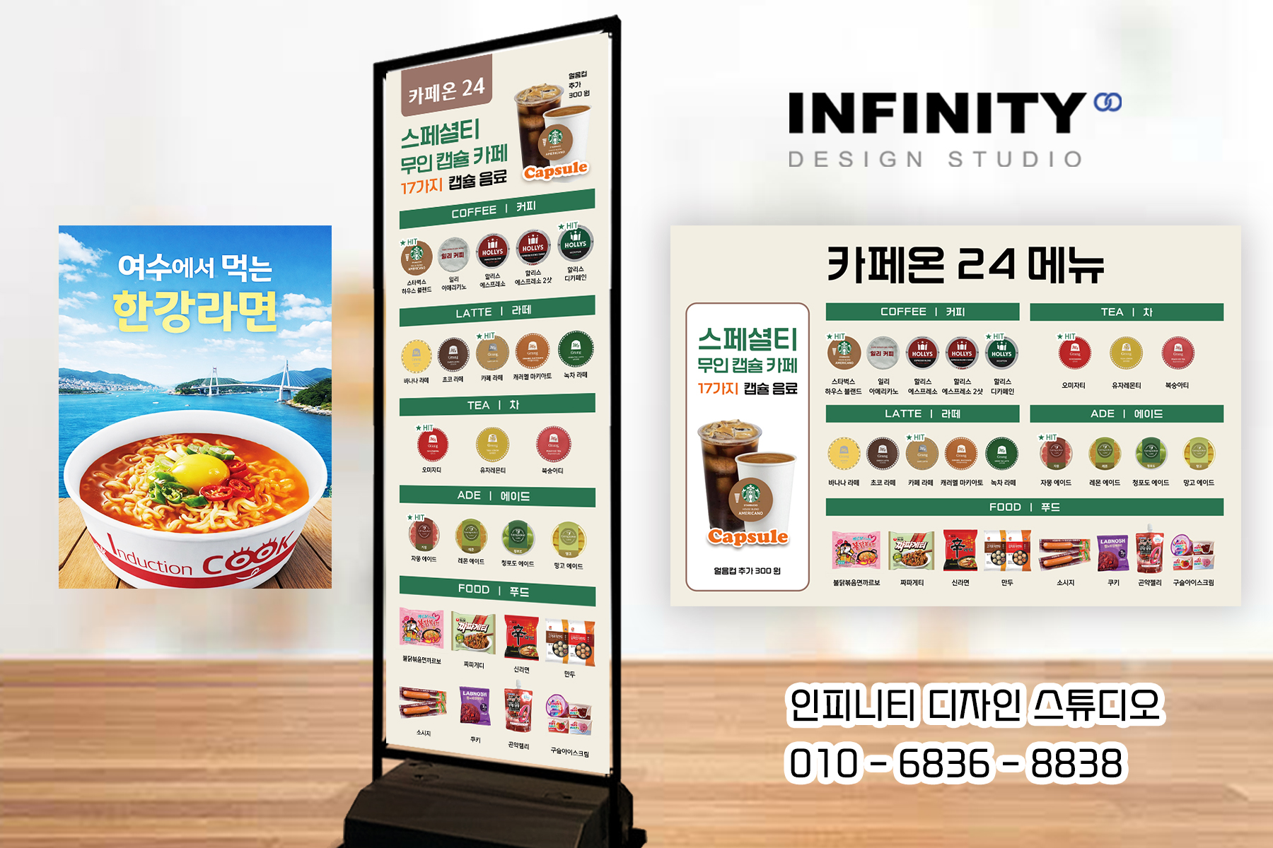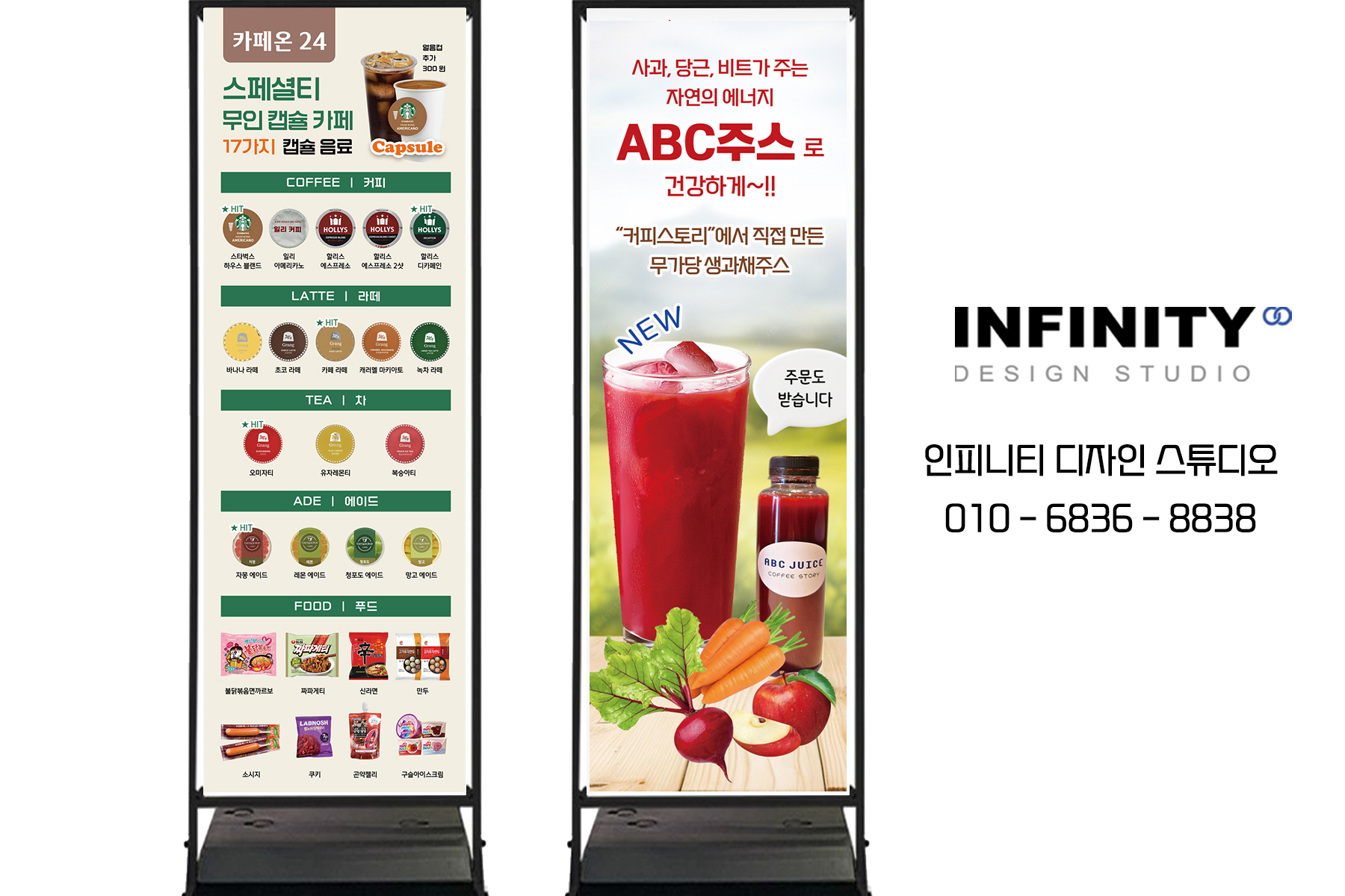 안녕하세요 :)디자인과 제작을 함께 진행하는인피니티 디자인 스튜디오입니다.오늘은 카페에서 활용하기 좋은 배너디자인 제작 사례를 소개해드리려고 합니다. 카페 운영 시 메뉴 안내와 홍보